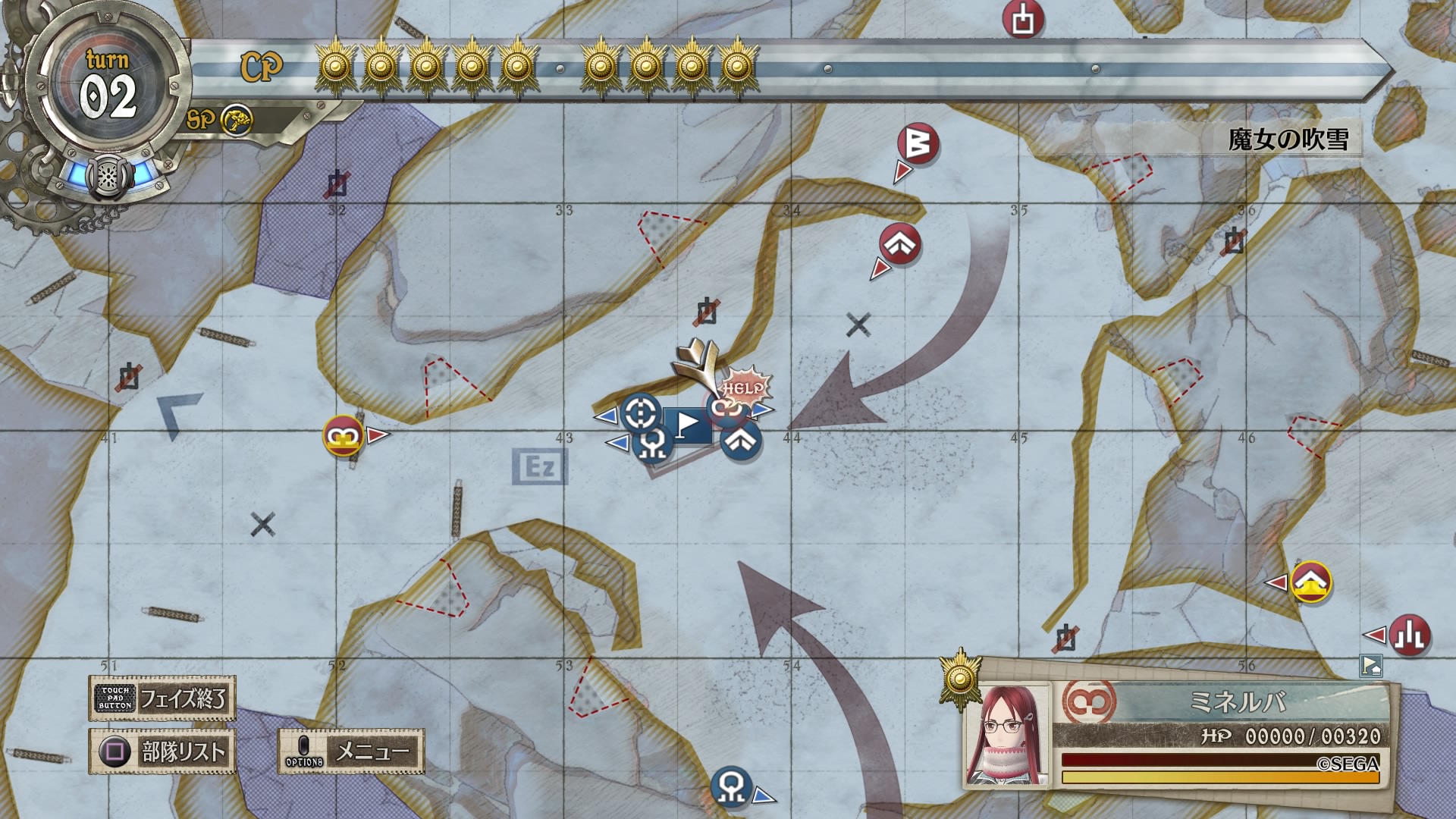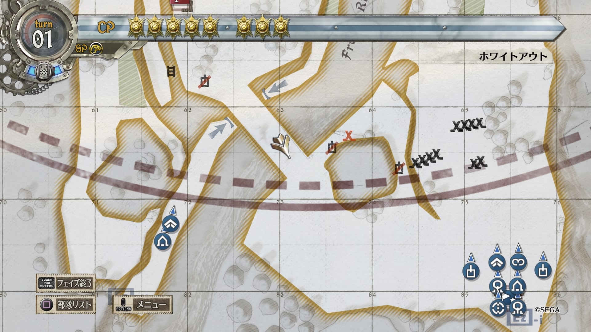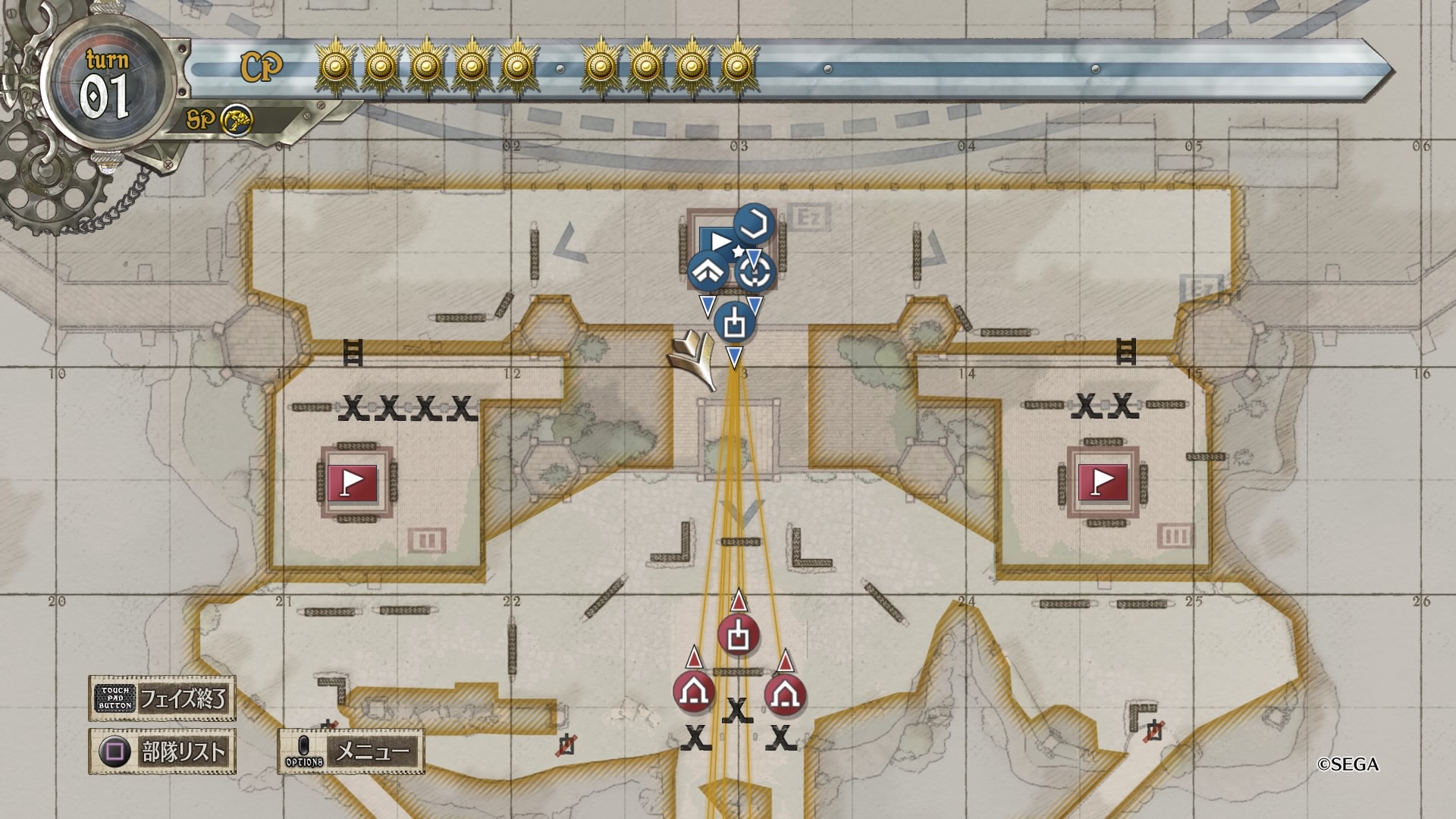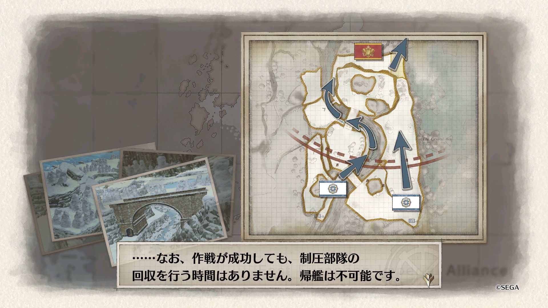 戦略マップをよく見ると、南北から伸びる赤矢印に対して西側に小さく青矢印が書かれており、これに従って敵のボスから逃れるように進軍するのがベターだったようです