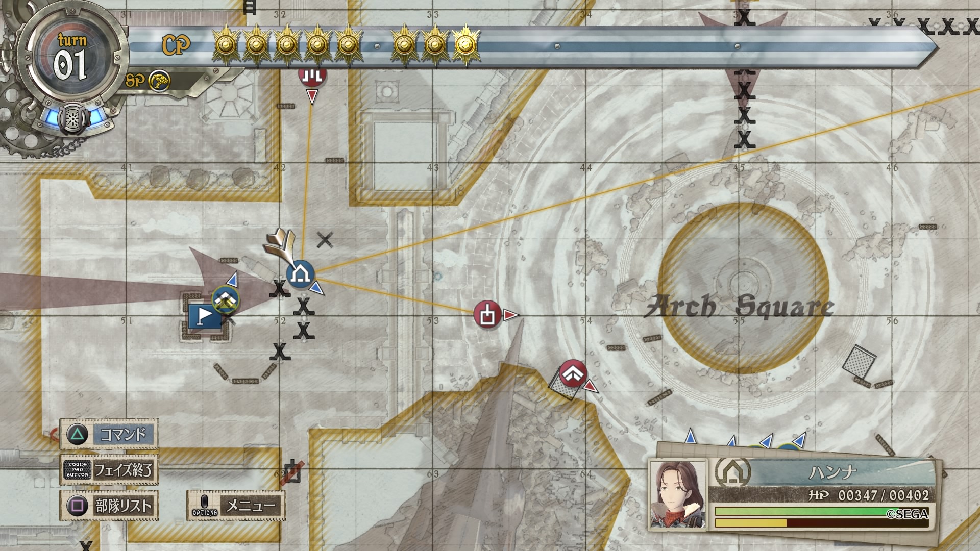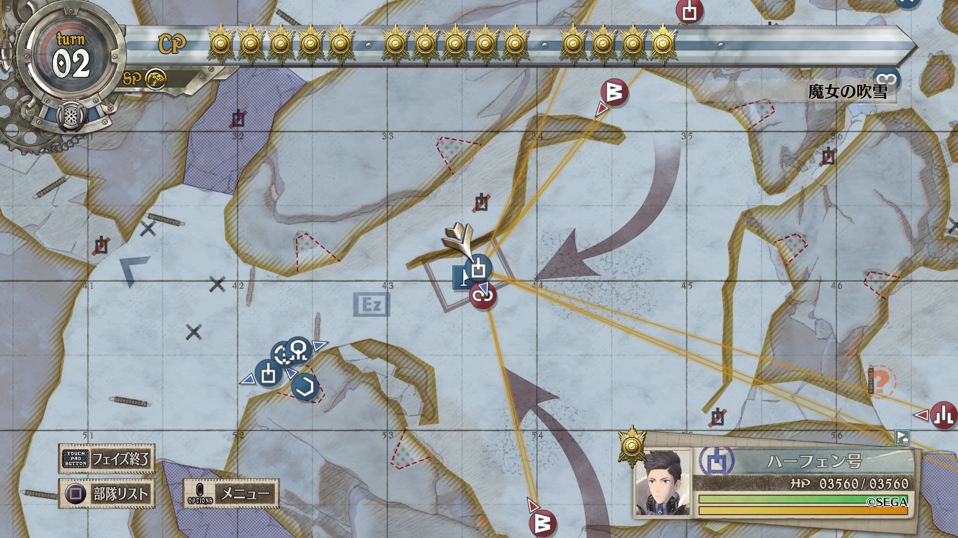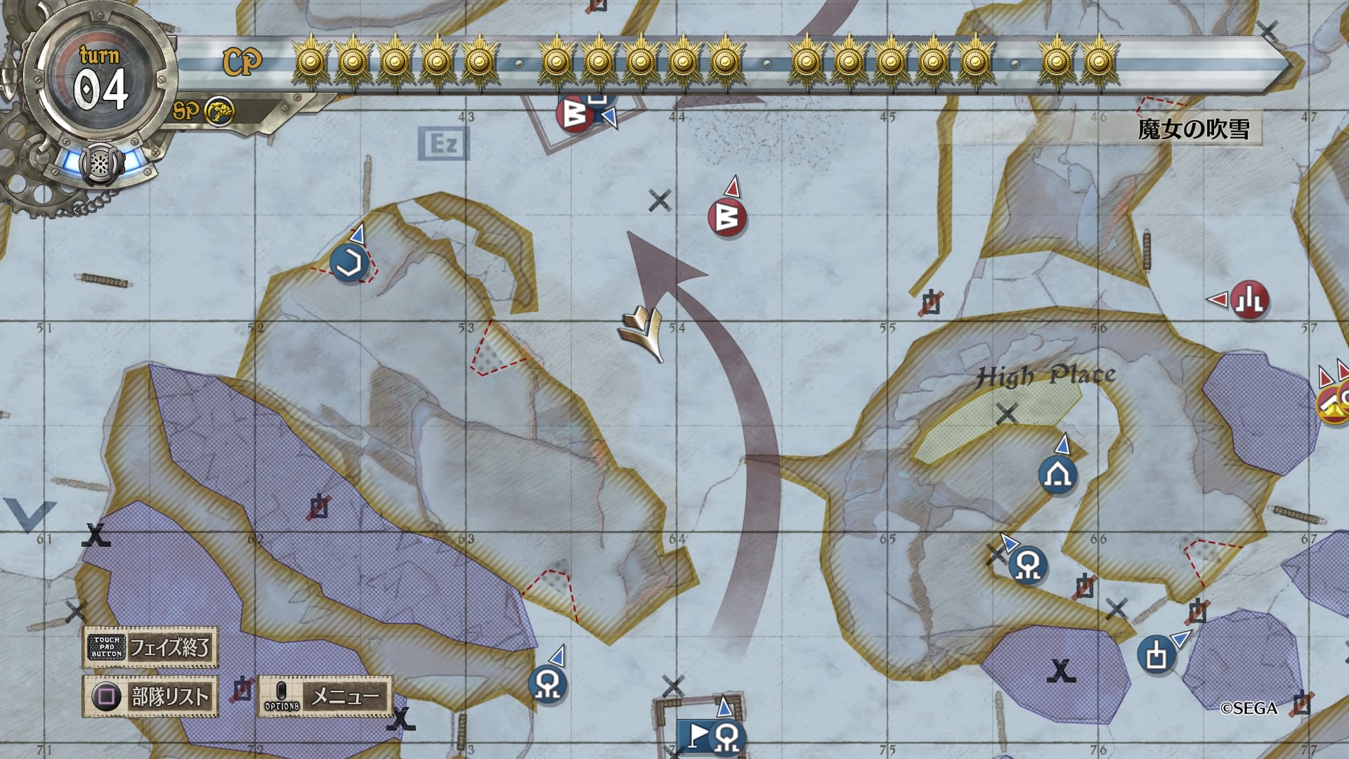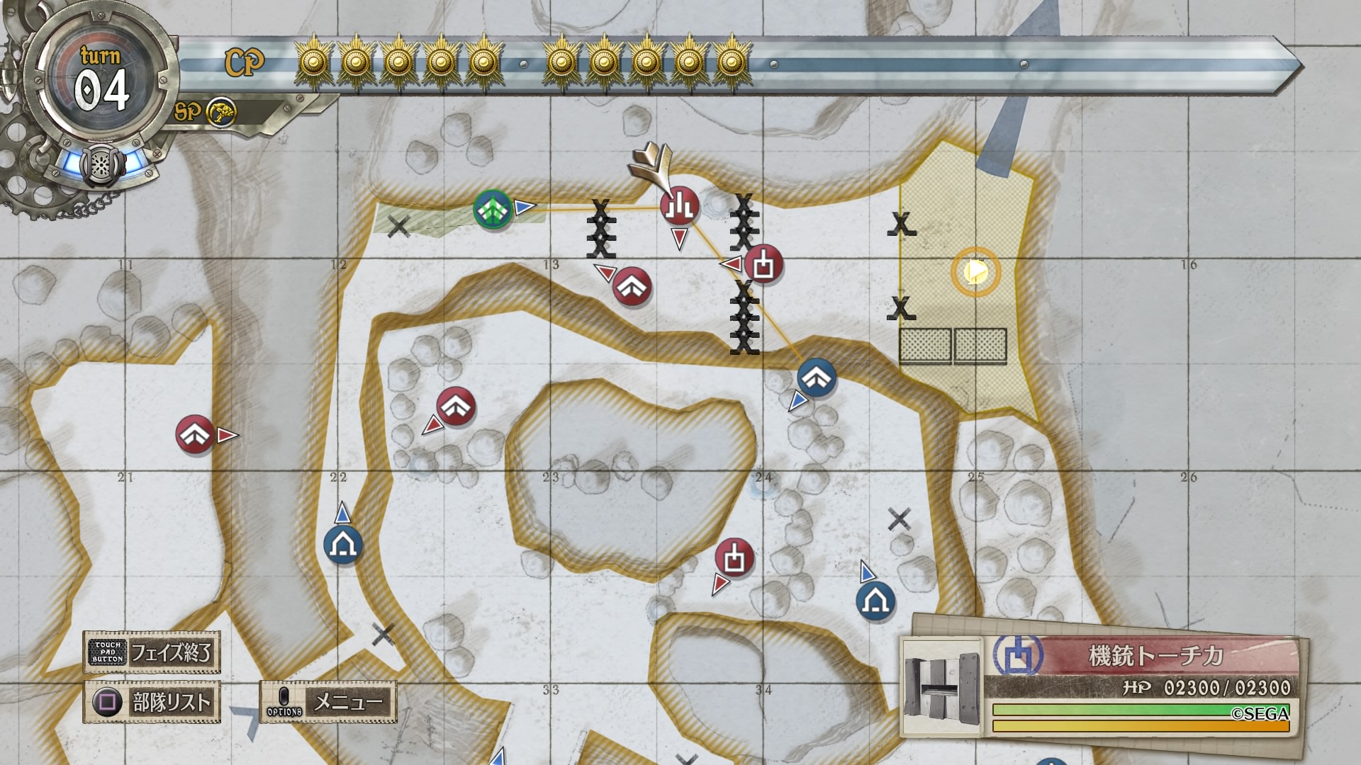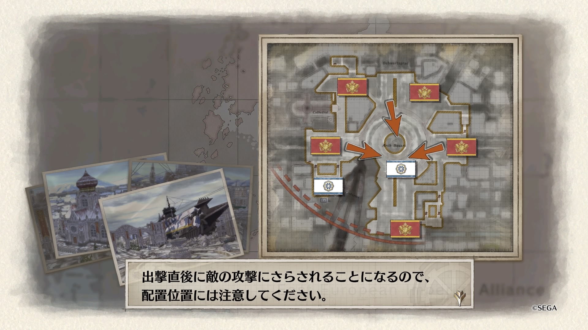 戦略マップをよく見ると、南北から伸びる赤矢印に対して西側に小さく青矢印が書かれており、これに従って敵のボスから逃れるように進軍するのがベターだったようです