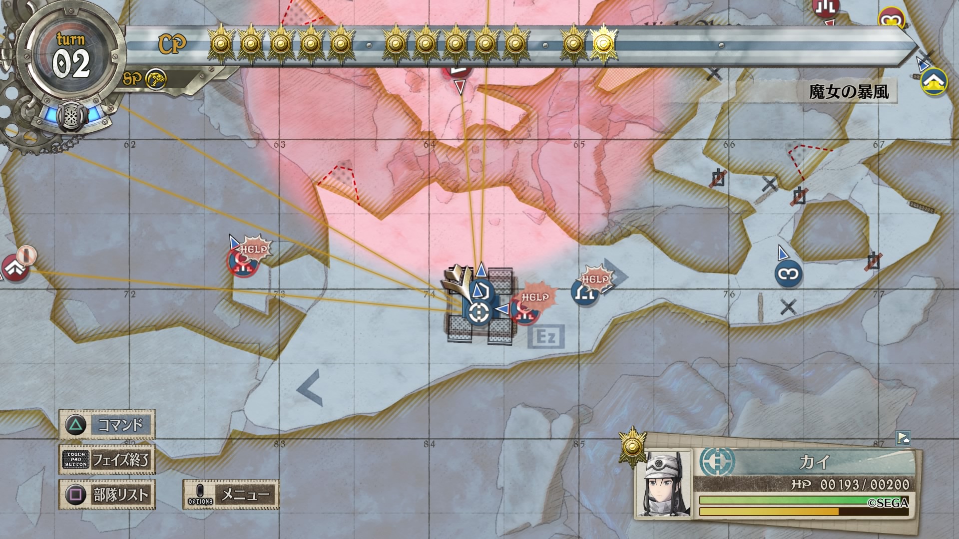 そして攻撃に巻き込まれたカイのすぐ後ろにいた支援兵は無事だったことから、その効果範囲は魔女の暴風と同じエリアであると推測できる