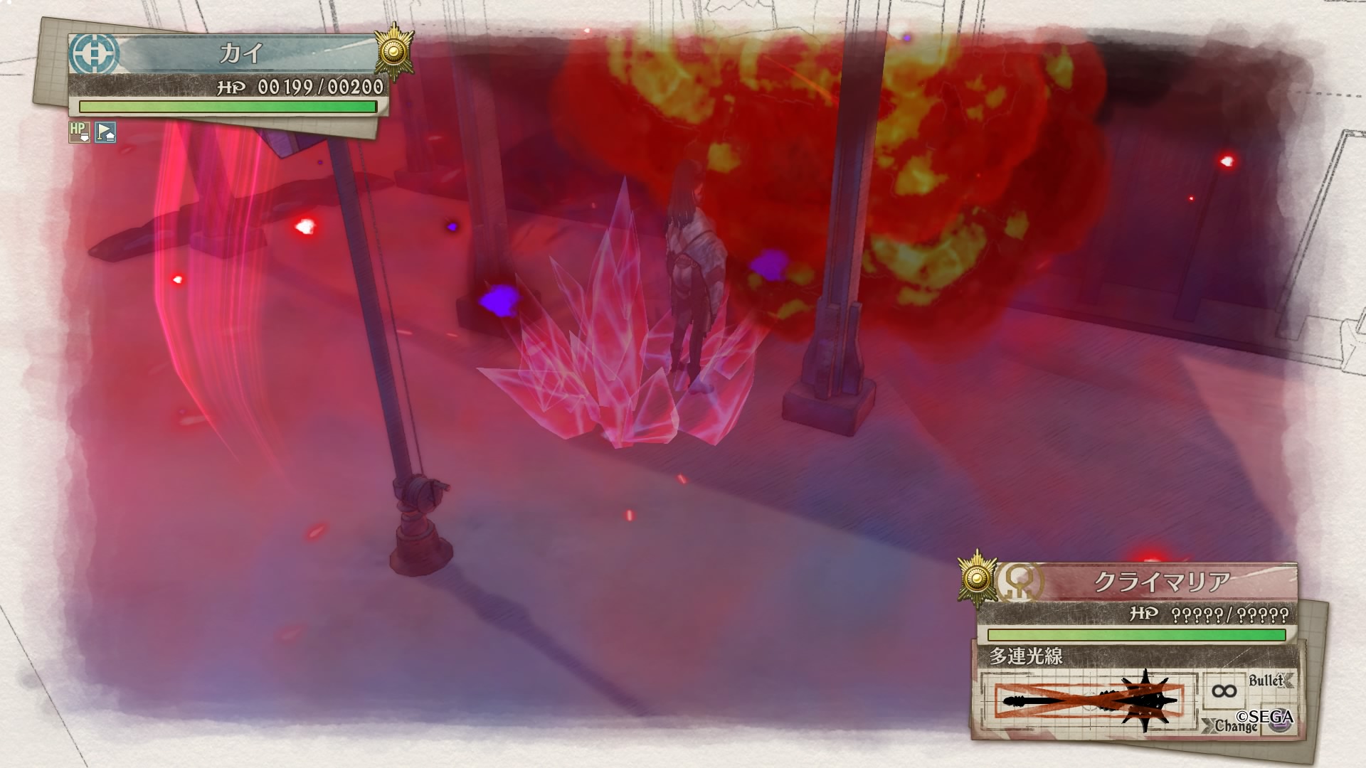 ボスが移動する際にこちらが発見される場合もあるが、クライマリアの場合は天井のある地形に隠れたり、高い遮蔽物の向こう側にいれば攻撃が遮られ無駄撃ちに終わることもあるので、これを利用すればクロードへの被ダメを抑えることもできる