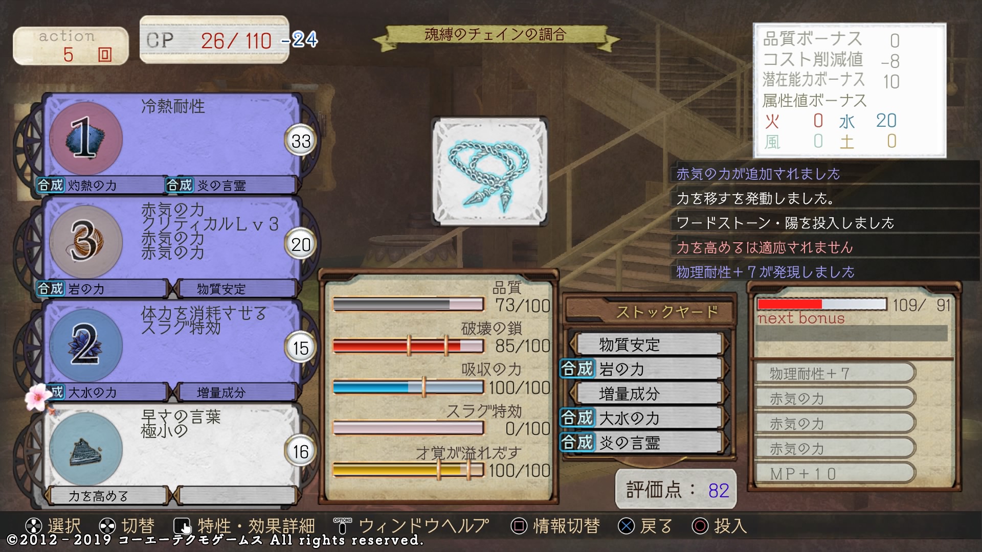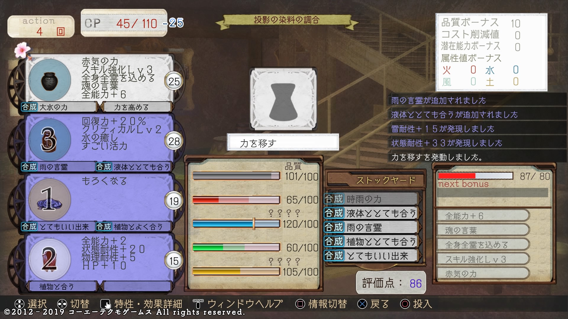 装備を作りこむ途中、持ってない潜在能力を探しに採取に行ったり、まさかのレシピ取り逃しで探しに行ったりと調合以外にも思わぬ時間を取られ、4月1日のタイムリミットも迫ってくるのでとてもハラハラしました