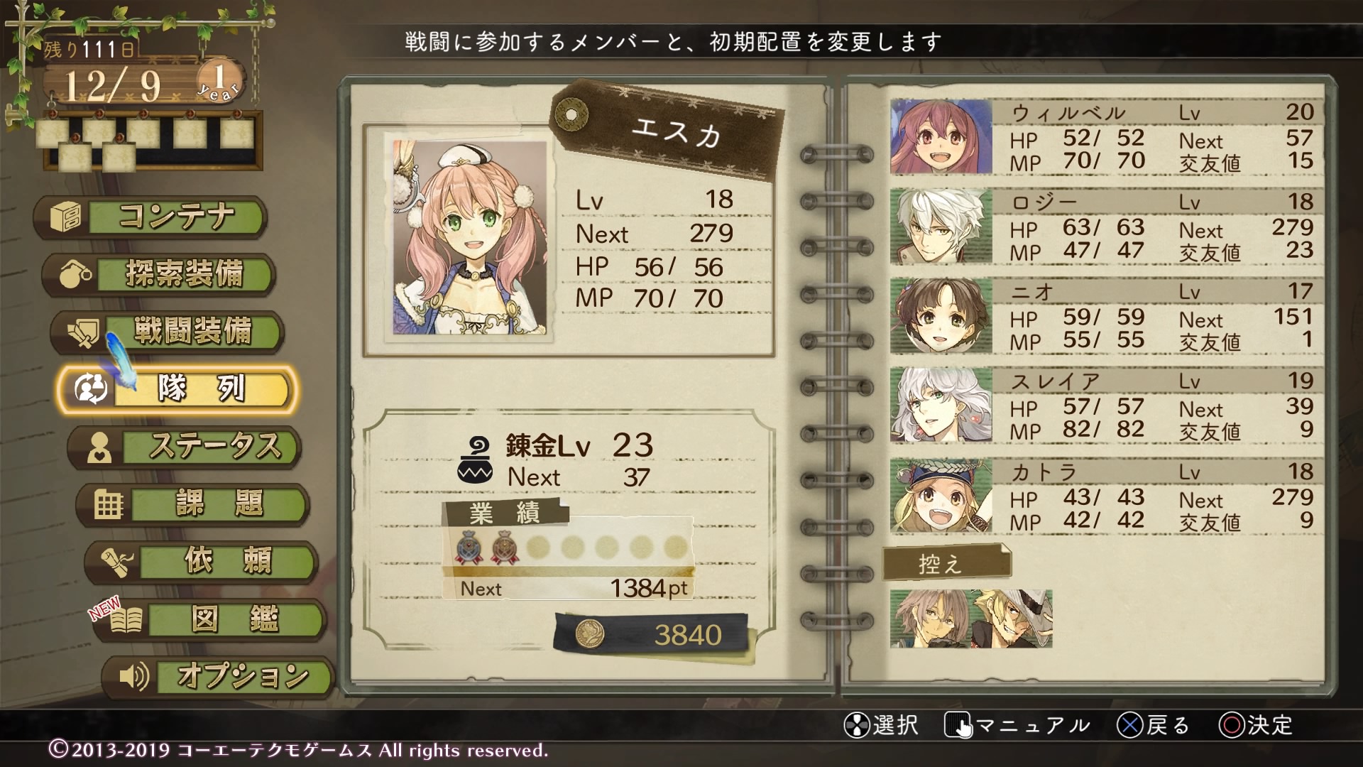 この段階でパーティは総勢7人となり、戦闘に参加させるメンバーと控えのメンバーを切り分けることに