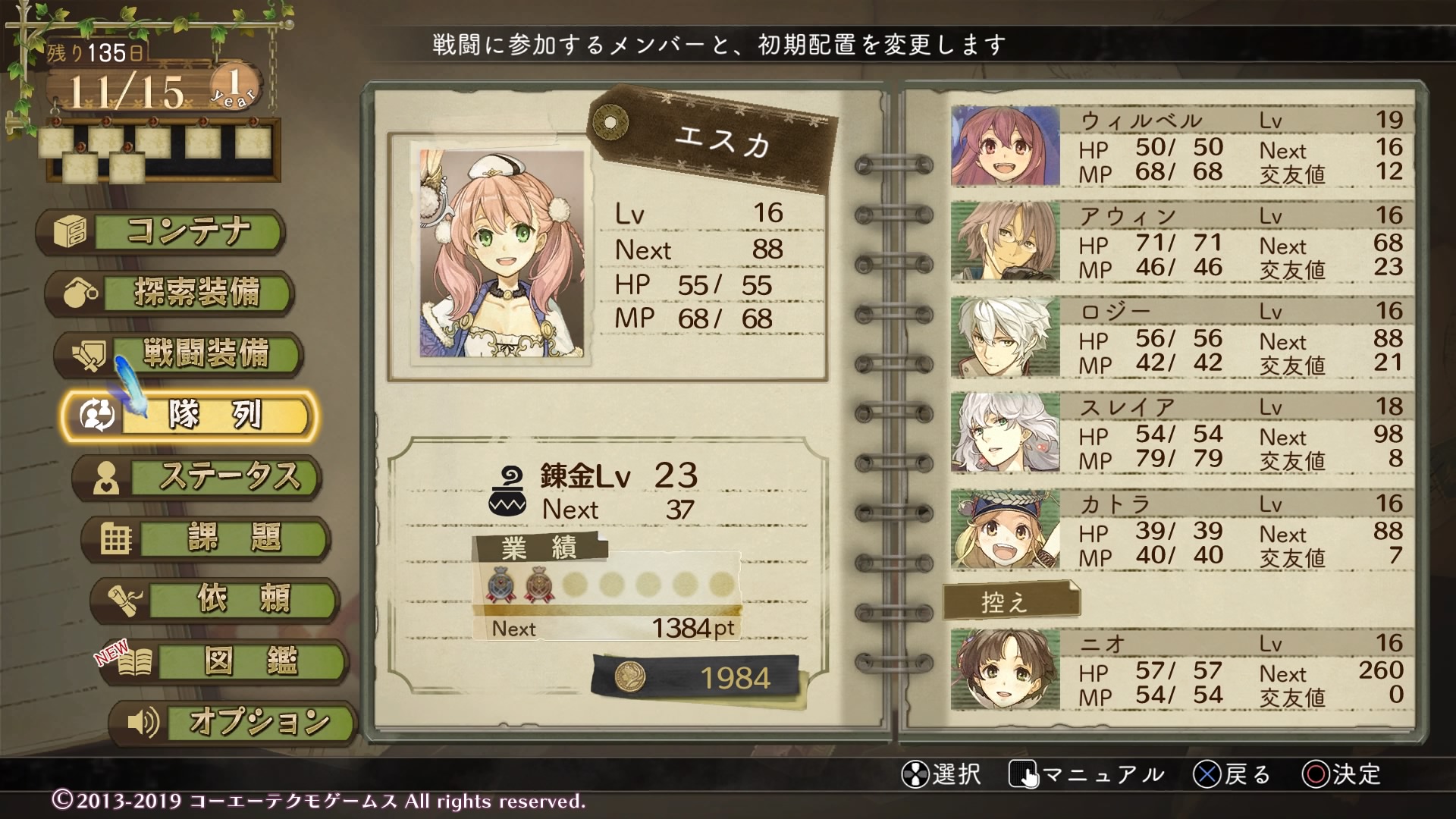今作は研究に資金を投入したり、調合中のスキルを使うことで調合の日数を縮めることができ、ほとんどのアイテムが1日でできてしまうので調合をしまくってもあんまり日付が進まないんですよ