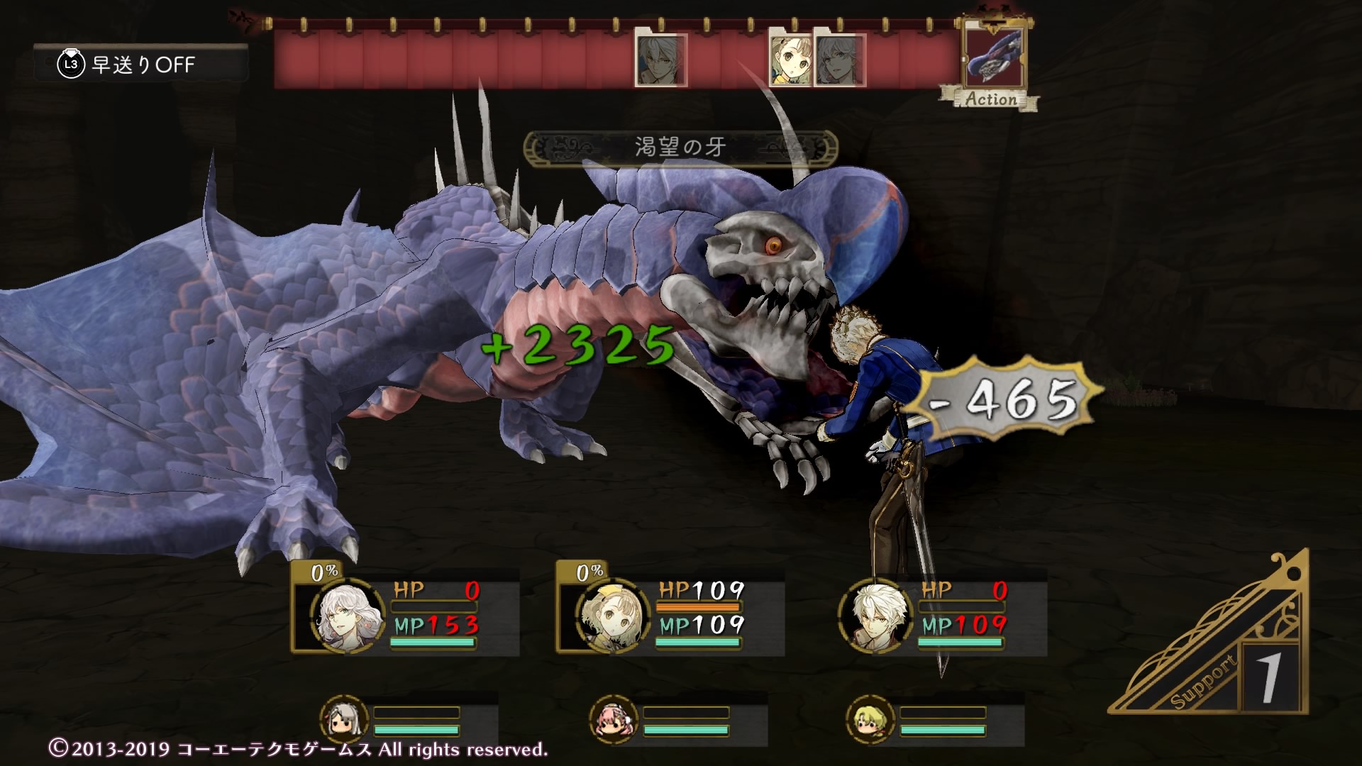 これまで戦ったことのある敵とは一線を画する強さで、3桁ダメージを与えてもHPゲージが減らない強敵ですが、こっちが全体攻撃で壊滅する前に倒せました