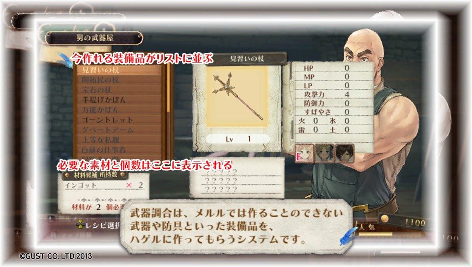 序盤に教えてくれれば順番に片付けていったし、強力な装備をもっと早く調合できたかもしれないというのに、このゲームやってて一番頭に来ました(# ゚Д゚)