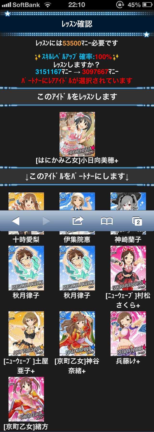 この時、特技LVを上げるためのレッスンの前にあらかじめN素材でLV29まで上げておいたのですが、実際にR以上のアイドルをレッスン素材として使うと予想以上に大量の経験値が入って、最後マストレを使う時にはLV62になっており、これだとLVが限界に達してマストレ4枚分の経験値が無駄になることがわかりました!