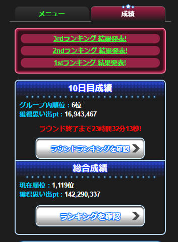 私の記憶が確かならイベントで個人順位が2桁台なのは今まで一度もなかったので、100位を割って更にここまで順位を伸ばせるとは夢にも思っておらず、素晴らしい成績を残せたと思ってます