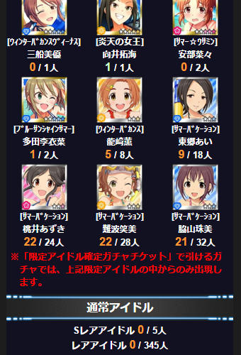 時々タイプ限定ガシャというのが開催されて、目当てのSSRを引ける確率が相対的に3倍になるのですが、私はSSRを2枚しか持ってないし目当てのアイドルも特にいなくて、誰でもいいよという状態だったので、タイプ限定だろうが新規SSRが引ける確率は変わらんわけですよ