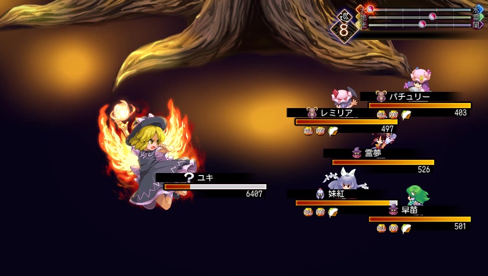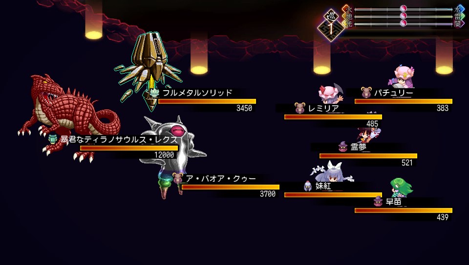 発動前に必ず予備動作があるのが救いなので、力溜めをしてきたら勇儀やゼラチナスマターのベネブランス・ウォールで全員をかばい、椛のフィジカル・ディフェンスで物理ダメージをカットしましょう