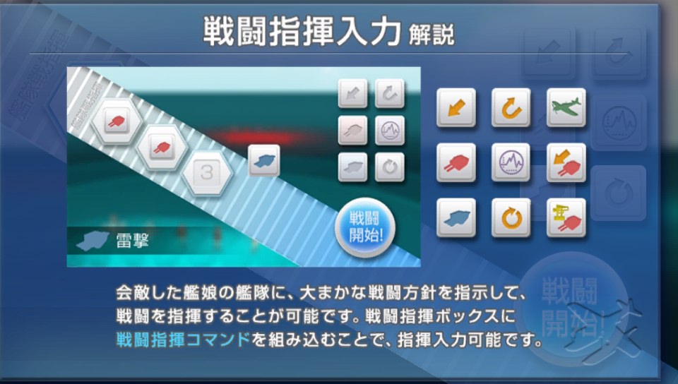 今作の敵艦隊との戦闘でブラウザ版と大きく異なるのは、ブラウザ版では開戦前に陣形を選択することが、プレイヤーが操作できる唯一のコマンドでしたが、艦これ改では戦闘指揮コマンドを組み合わせることで、攻撃手段や回避行動を細かく指揮できるようになりました