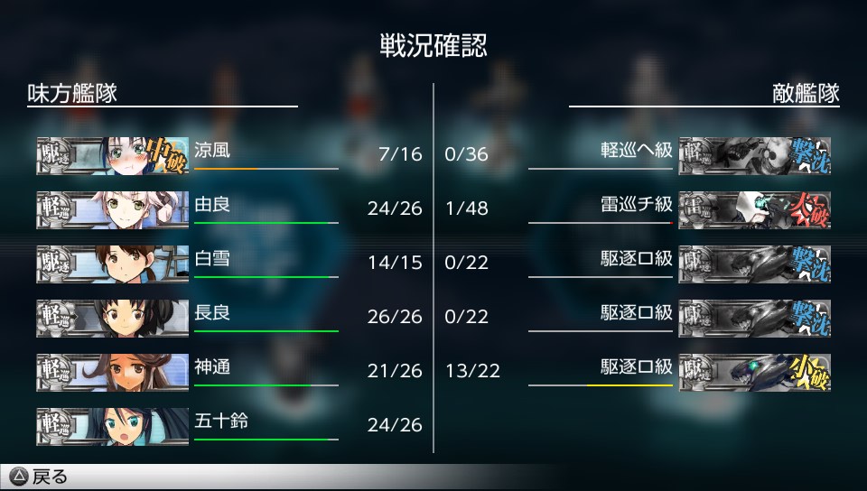 まずそこまで行く前に初戦の開幕雷撃1発で大破撤退というケースもあるわけなので、出撃してボスにS勝利できる確率は6割程度でしょうか
