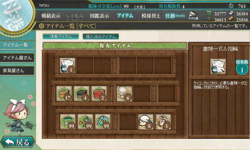 3週間ぶりにカムバックするって言っても、前みたいに任務とかレベリングがっつりやる時間はないから、新規追加の艦娘、システム、家具、海域をざっと見る程度にしよう。