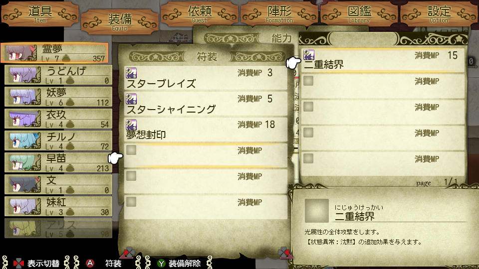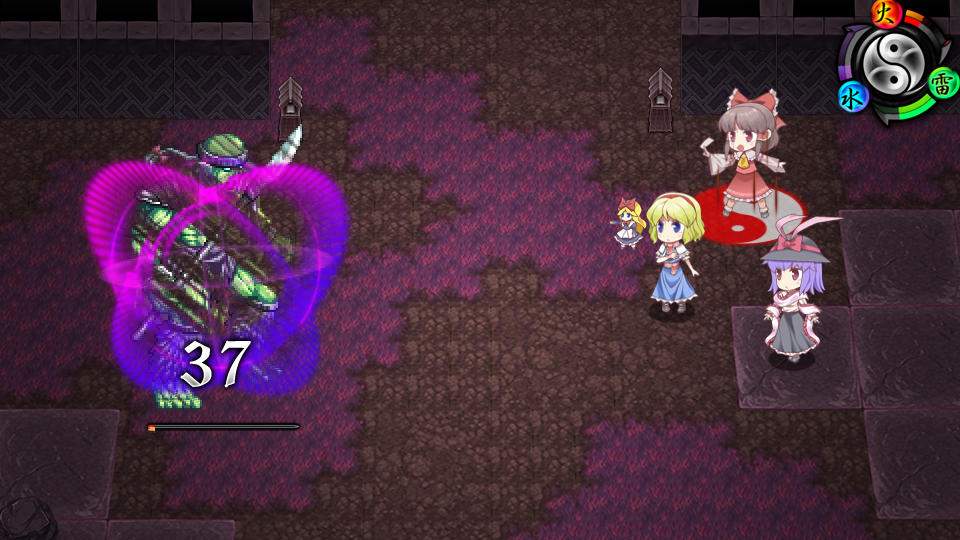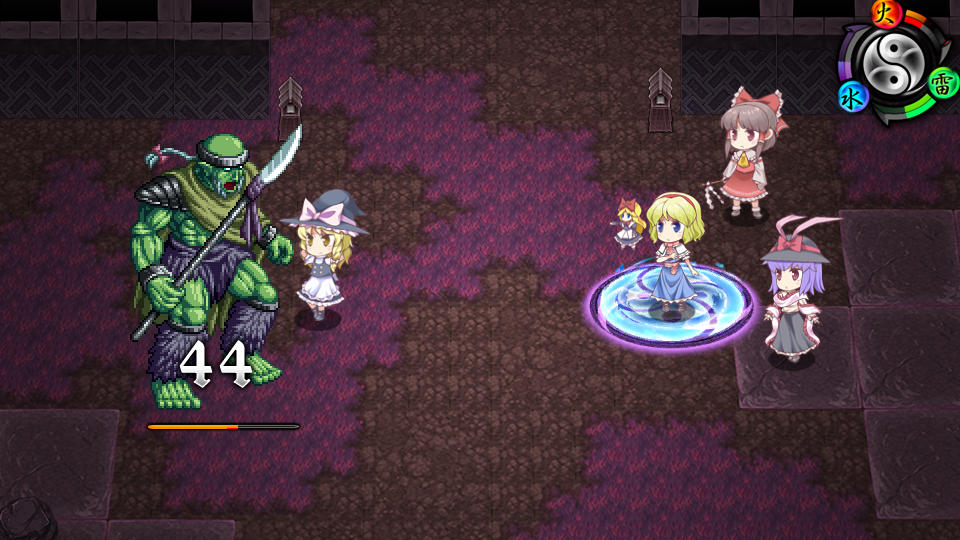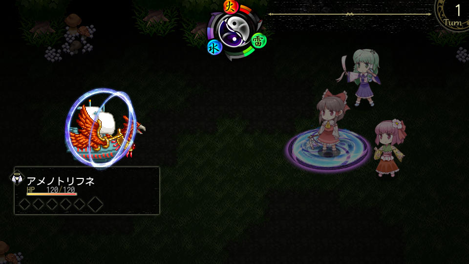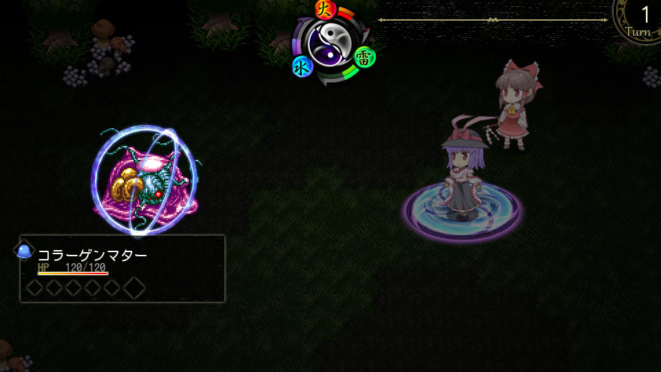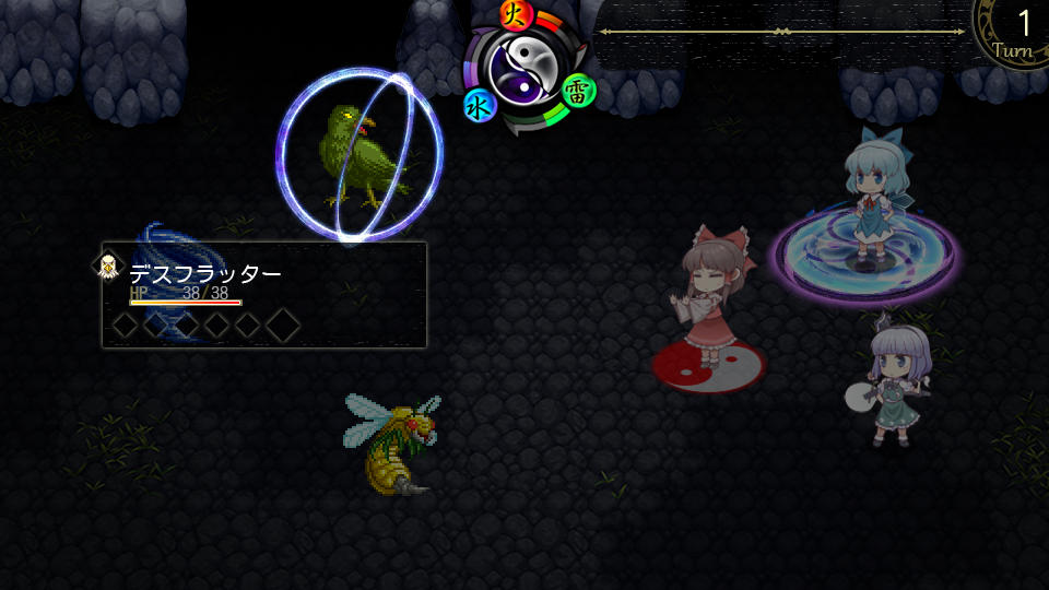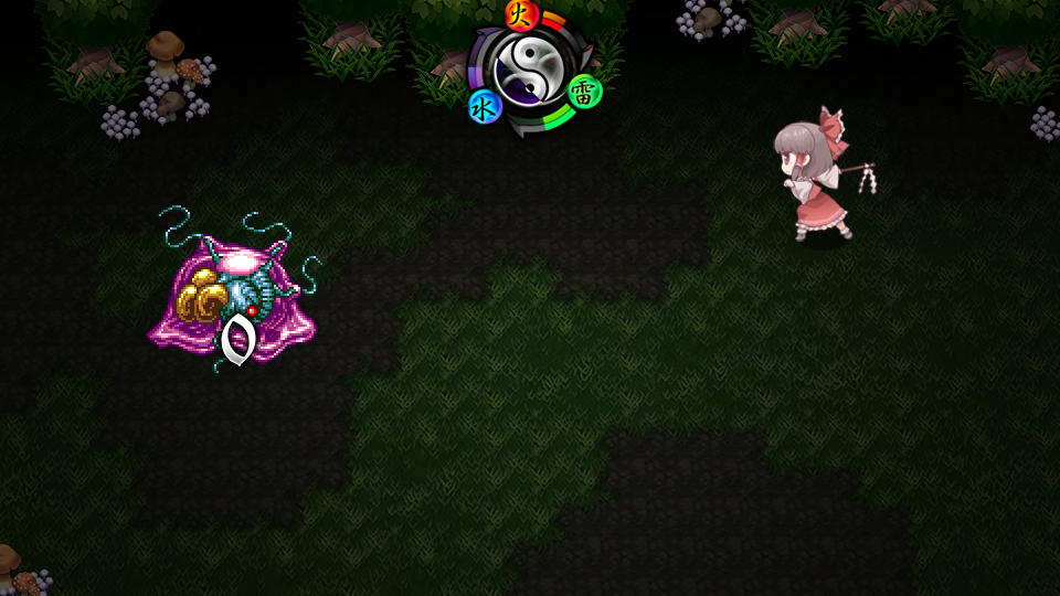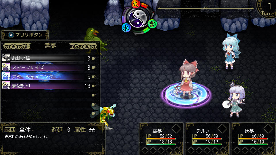 これをダメージソースとしつつ、今作では戦闘中に同じ属性の攻撃をし続けることでフィールドの地相が傾き、属性ダメージが増加することを利用して、霊夢の光属性スペルと合わせて光水晶を量産して撃ちこむことにしました