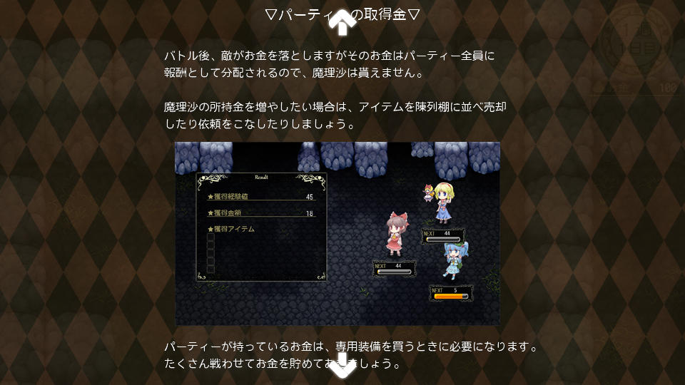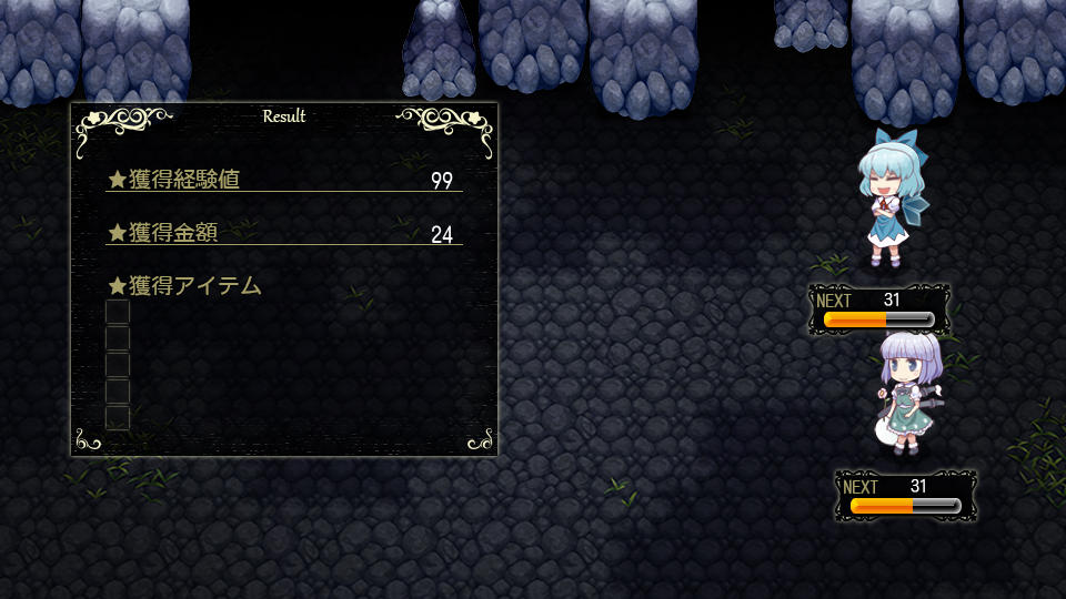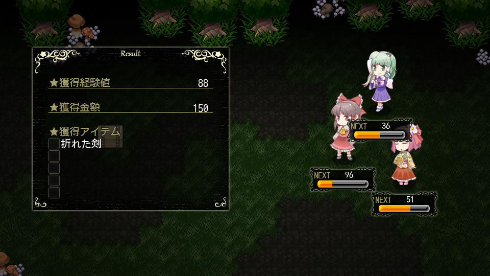 また、戦闘に勝利すると得られるお金は、魔理沙ではなく戦闘に参加したキャラの所持金に加算されます