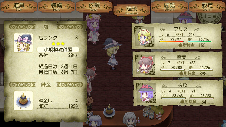 お店では水、酒、緊急薬という素材が無限に入手可能で、何回錬金しても時間が経過しないのは、スケジュールを気にする必要がなくて楽チンですね