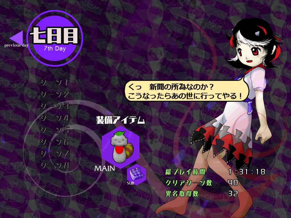 5日目からは中盤BGMのロマンチック逃避行が再生されるのですが、このBGMは笛の音がメインとなっており、風神録4面ボスの文のテーマ、妖怪の山と似たような感じがします