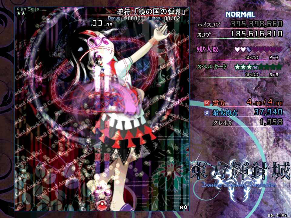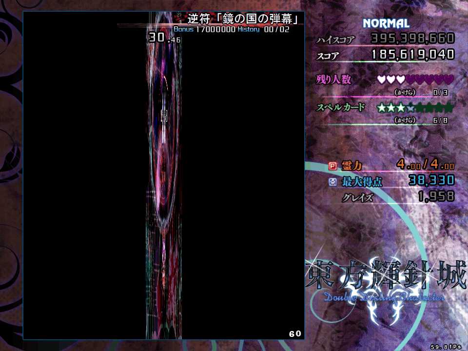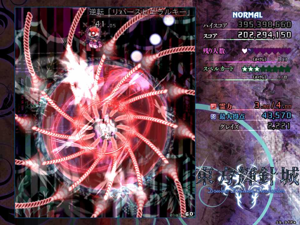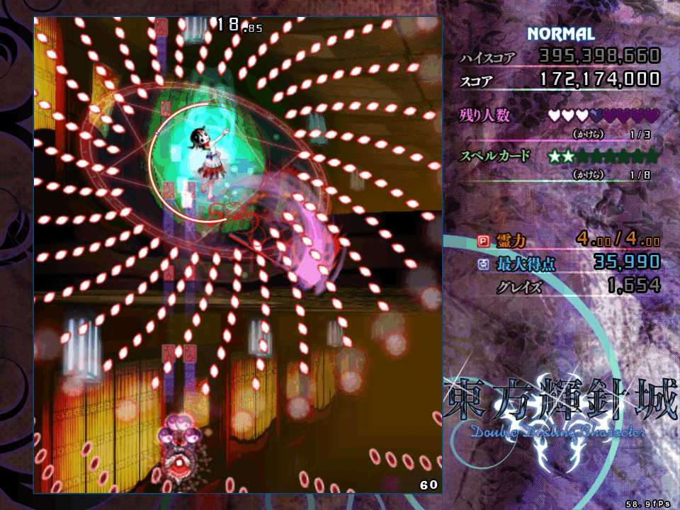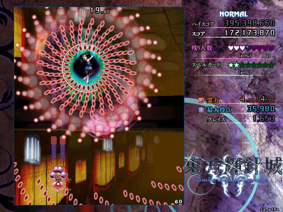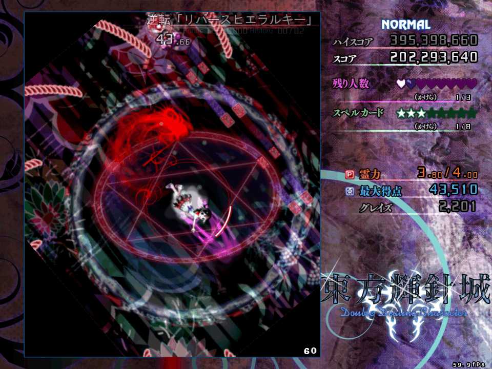 上下の操作系が逆転するので、正常に機能する左右移動のみで切り抜けたいが、今度は第1スペルの弾幕と異なり斜め方向からも飛んでくるので左右移動のみだと難度が高い