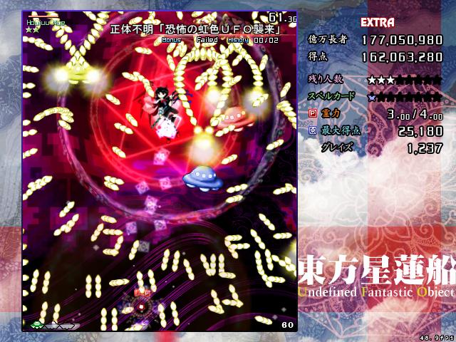 霊夢Bでのクリア時は道中を赤UFOで1エクステンド、1ミスで攻略した