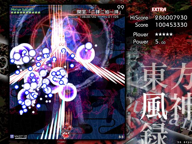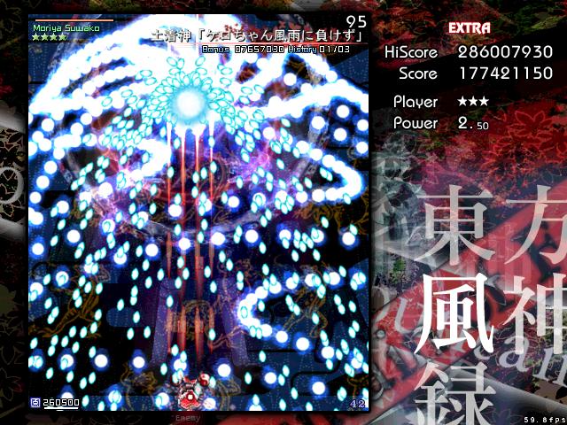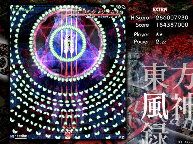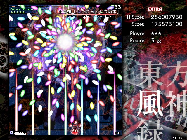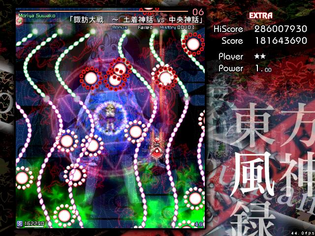 風神録のEXは他作品よりもエクステンド回数が少ないが、霊撃が強力でパワーをとると回復するという特徴から、とにかくパワーを抱えたままミスしないことが肝心。オプションがなくなるまでは霊撃前提で挑めってことね。(攻略Wiki参考)
