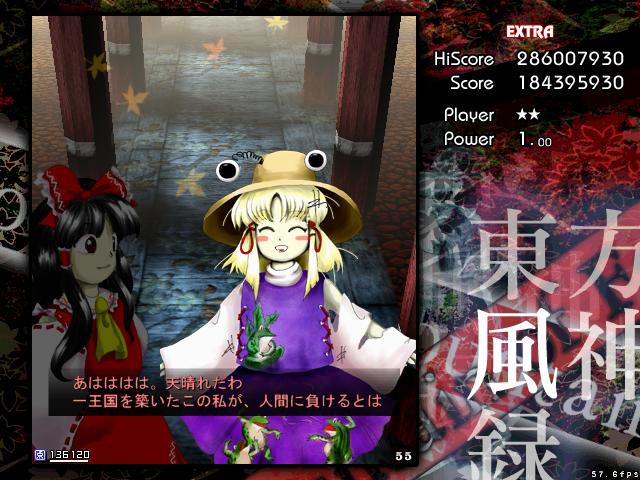 まあ紅魔郷のイージーだと最終面すらやらせてもらえないのでそれよりはマシだけど、せっかくがんばってラスボスの神奈子様倒しても、EDではこっちがぼろ負けしたような描写になってるのでちょっと悔しい。