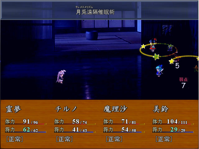 開幕直後に鈴仙はラストスペルの「テレメスメリズム」を使用。敵全体を睡眠・混乱・命中低下状態にするという鬼畜スペルです。