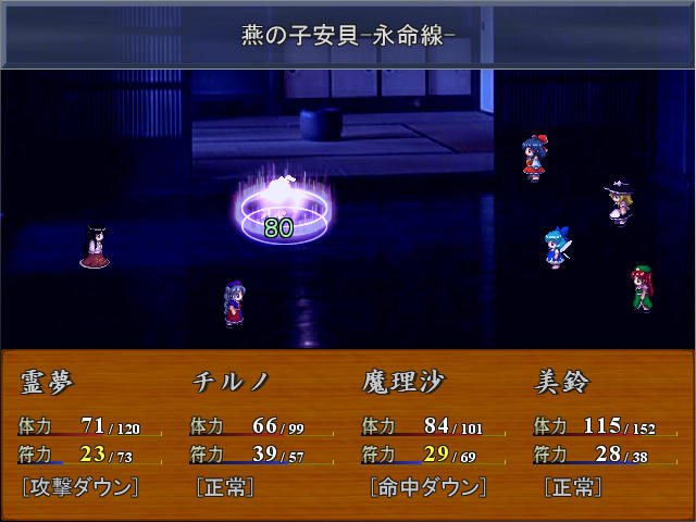 気を取り直してもう一度挑戦。最初に全体攻撃を交えつつ鈴仙を優先して攻撃。鈴仙はすぐに復活するがしばらくは放っといて永琳を攻撃。そして永琳を撃破したらもう一度鈴仙を倒し直す。永琳を復活させるのは輝夜なのだが、この場合復活した永琳のHPは100以下なので次のターンに速攻撃破できる。しかし永琳の行動速度が速いために倒す前に鈴仙を復活させてしまうんだよな~。そんで永琳を倒したら次は鈴仙で、その間輝夜が永琳を復活させるから鈴仙倒したらすぐに永琳を攻撃するんだけど、また永琳が鈴仙を復活させて……って、これいつになったら終わるの?