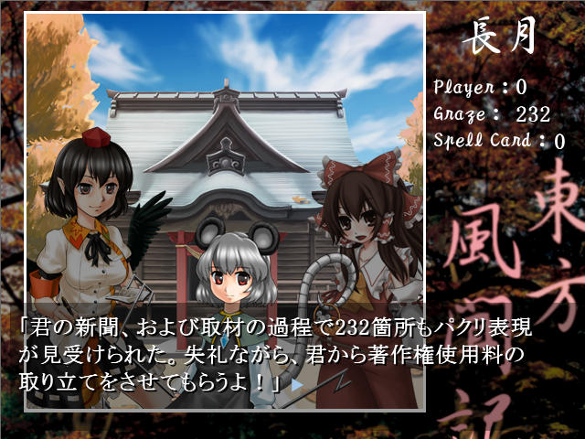 最後ナズーリンにグレイズの数(パクリ記事の数)を指摘されるけど、これが結果的にバッドエンドなのかノーマルエンドなのかはわかりません
