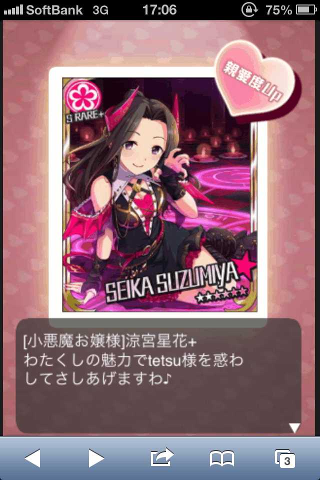 言い方変えるとこのパワー持ちのアイドルを所持しないと上位ランナーに名乗りをあげられなくなるほどで、私も手持ちのドリンクを支払ってこのパワー持ちアイドル、SR+涼宮さんを購入