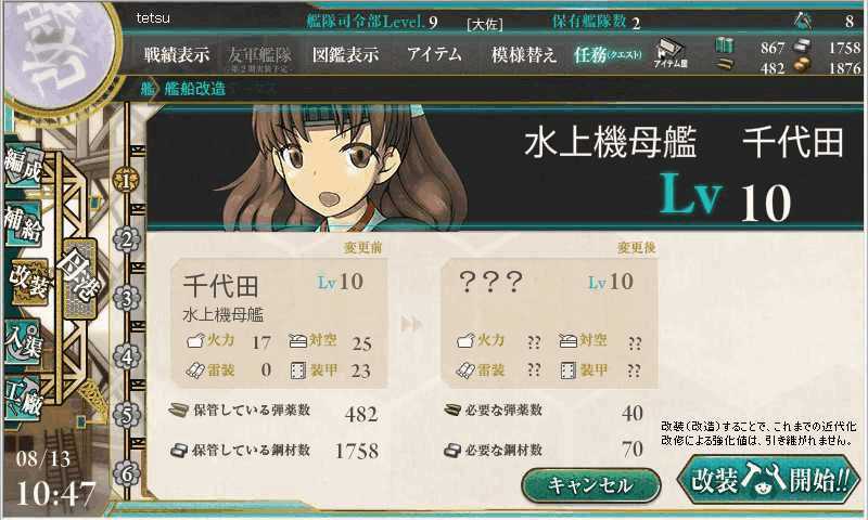 必要なレベルは艦娘によって異なり、クラスチェンジ後に何になるかも艦娘によって固定