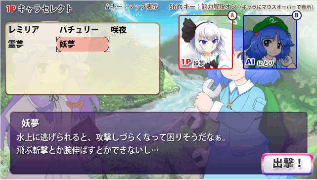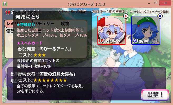 にとりは自軍の全ユニットを水上移動可能にする能力を持ち、さらに水上にいるユニットの能力を上昇させる