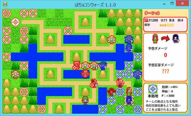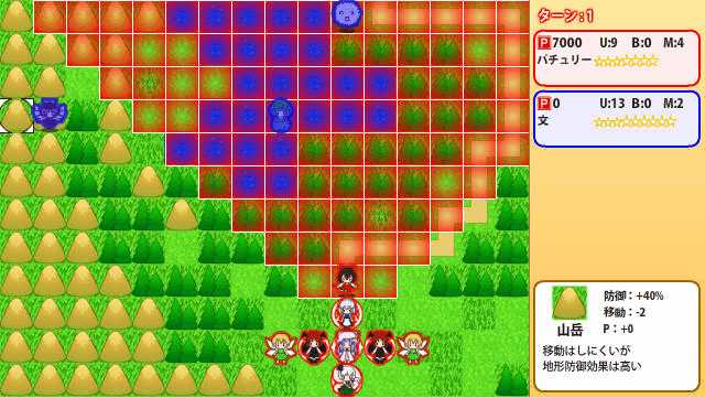 マップは山岳地帯なので敵には地の利があり、山や魔方陣の上にいる敵にはほとんどダメージが入らないので、敵を山地からおびき出すように誘導してやる必要がある