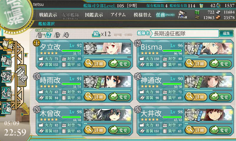 さてどうしたものか・・・とりあえず明日、軽空母+支援艦隊作戦で2回チャレンジして、ダメだったら来週にかけます。