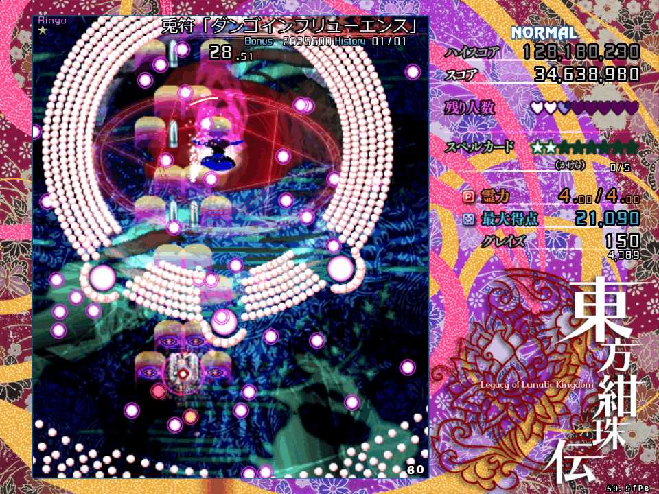 そして3面ボスは、通常が3種、スペルカードが3種というのが定番だったんですが、今回はスペルカードを4種も使ってくるという、シリーズ経験者もお腹一杯になるボリュームがあります