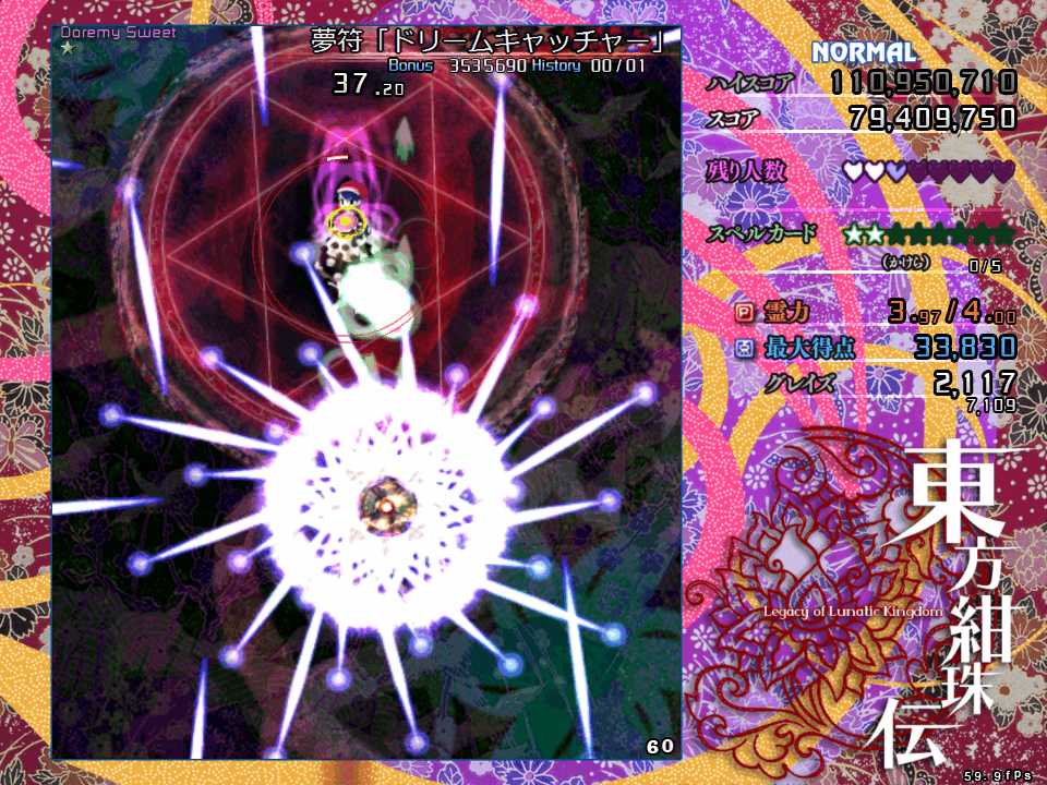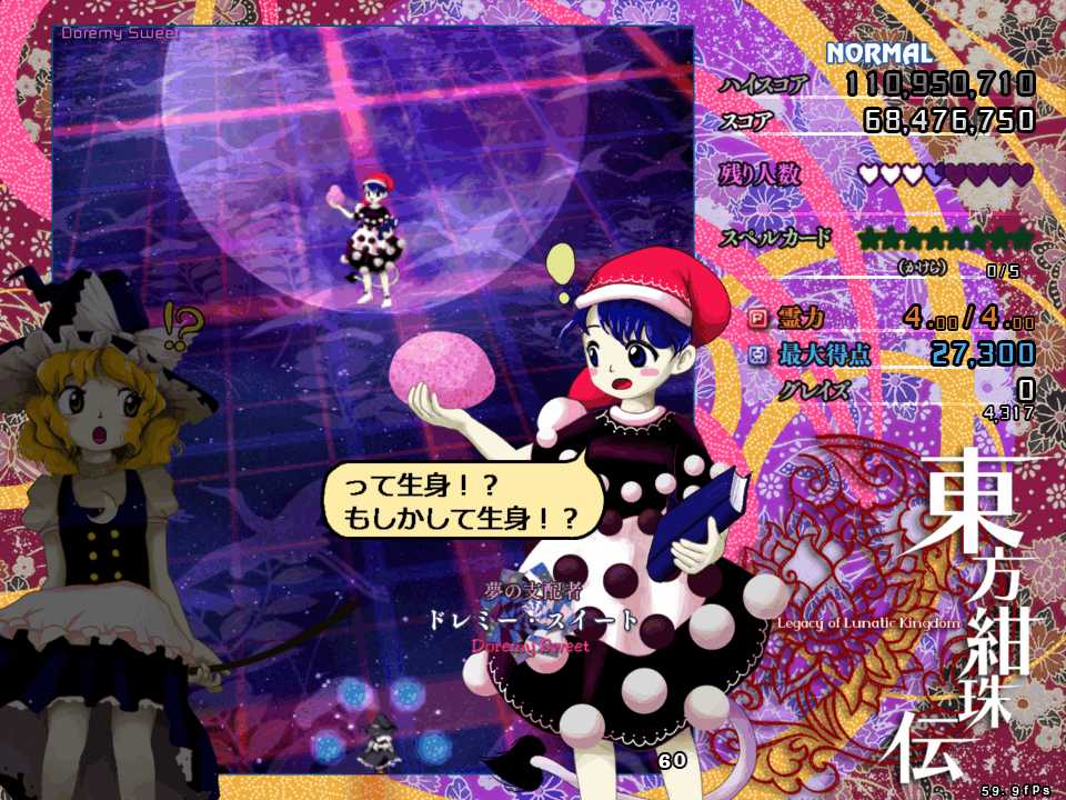 夢を喰う獏というだけあって、ドレミーのスペルカードはそのほとんどが自機を飲み込むように自機の周囲に弾幕が出現し、こちらの動きを大きく制限してきます