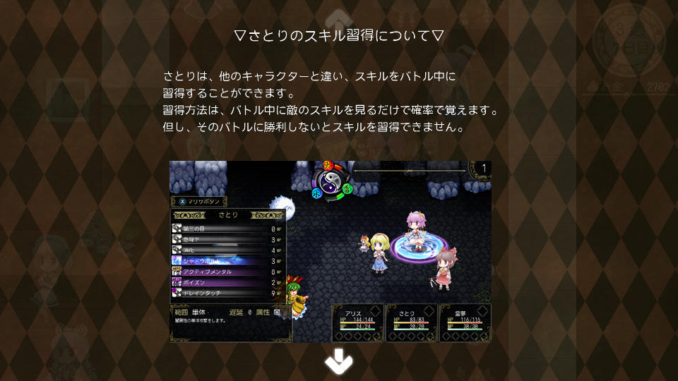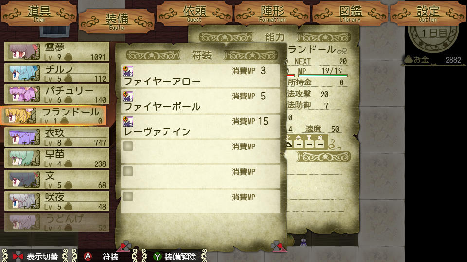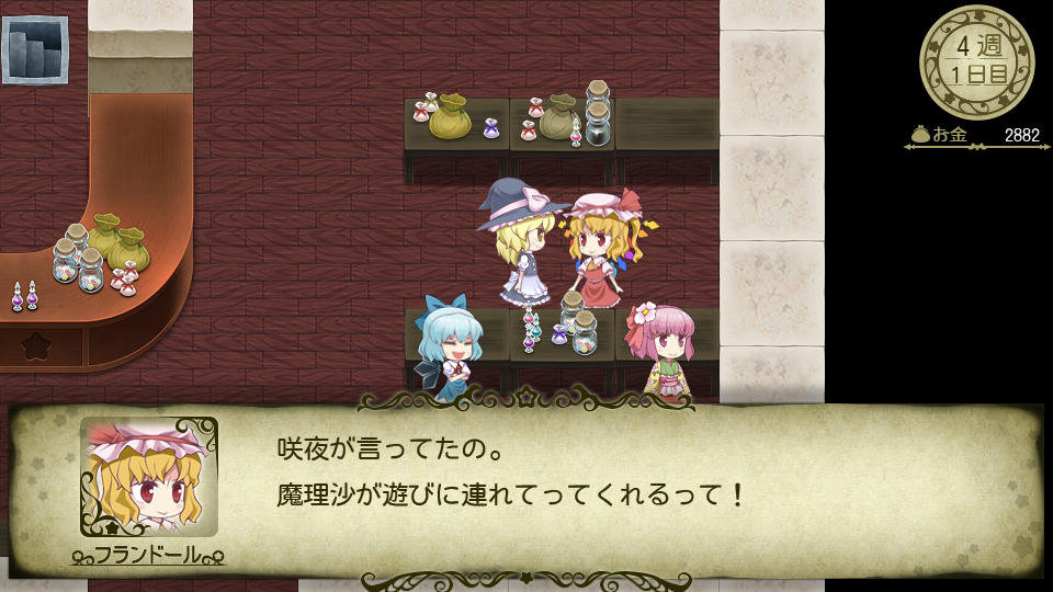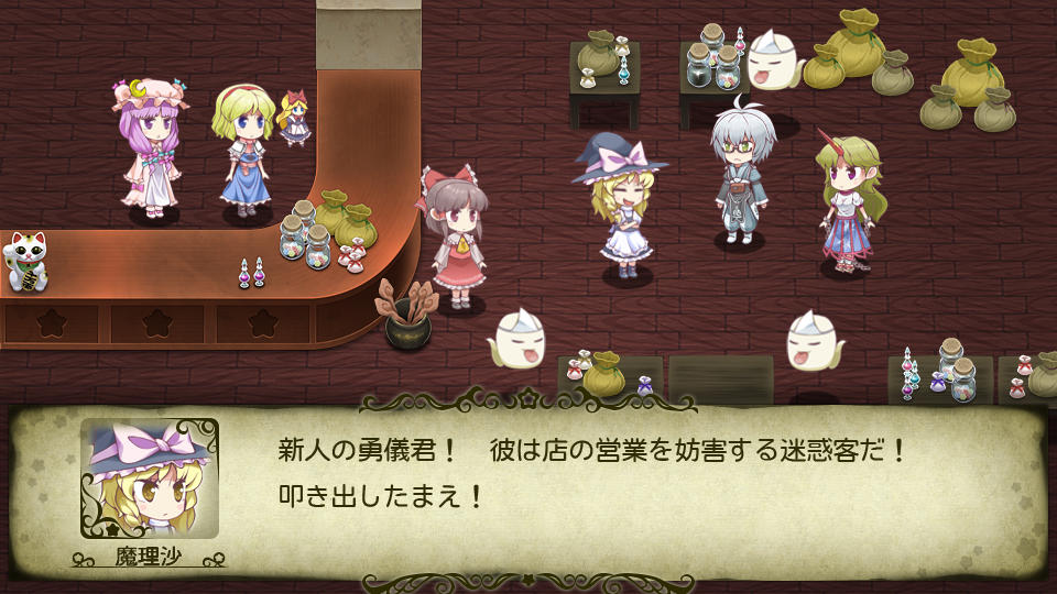 さとりが仲間になりました さとりは敵のスキルをラーニング出来るぞ! 店舗の発展課題が複数発生 部門の設置数には制限があるので、達成する順番に注意 フラーン!(゚∀゚) 妹様は特別強キャラなわけではなく、チルノの火属性互換のような性能だ ひじりーん!(゚∀゚) 聖は闇魔法のエキスパートで、性能は霊夢と同じ