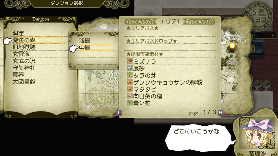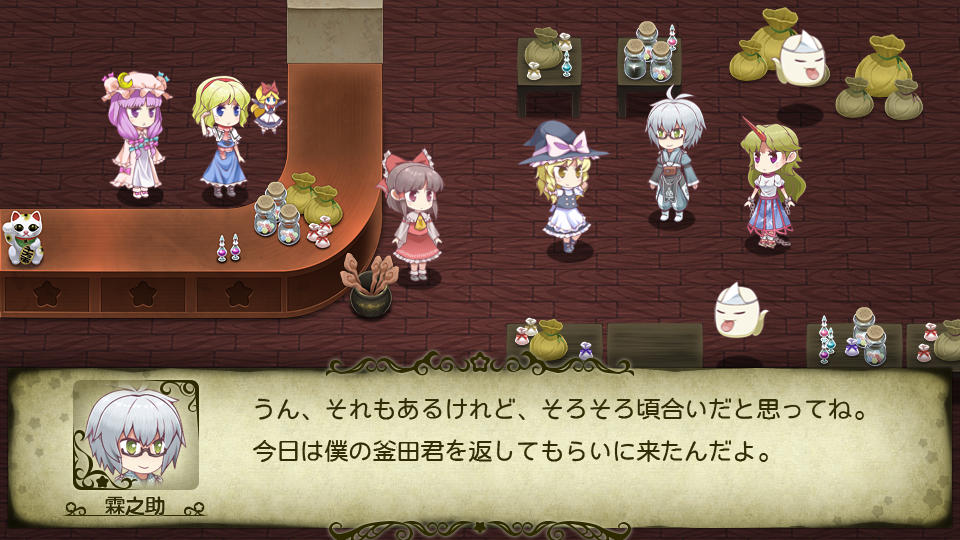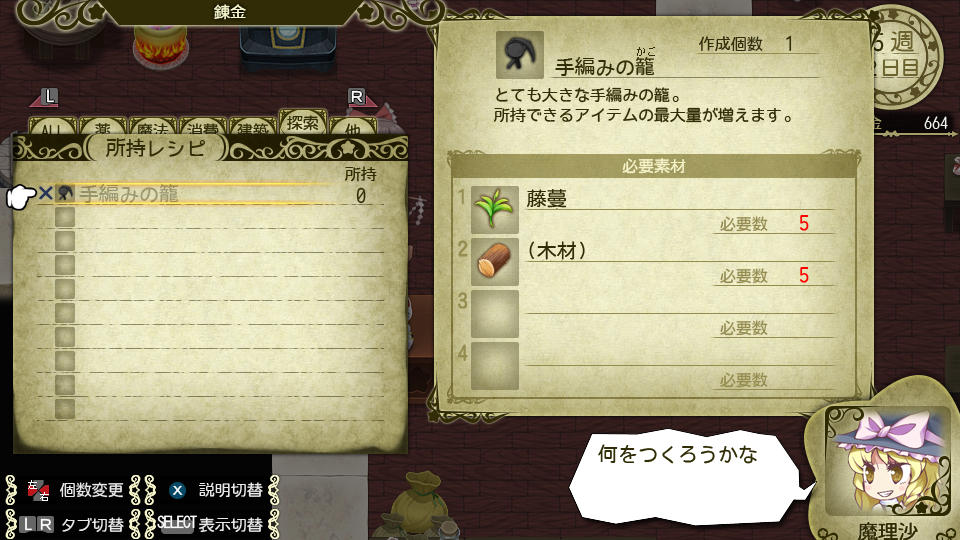 探索カテゴリに手編みの籠が追加 所持できるアイテムの数が増えるため、最優先で錬金したいけど素材の入手元が不明(´;ω;`) 店ランクが4になると勇儀が加入 んー、でもなんで勇儀? 霖之助が釜田君の返却を求めてやってきた それがないと錬金できなくなるんだぜ! えええーーー!?www 店ランクが4になると同時に大量のレシピを習得 4ページ分もある! 店がさらに大きくなり、店内の配置も変わった そして全てのダンジョンに中層が追加!!見たことのない素材で一杯だ!