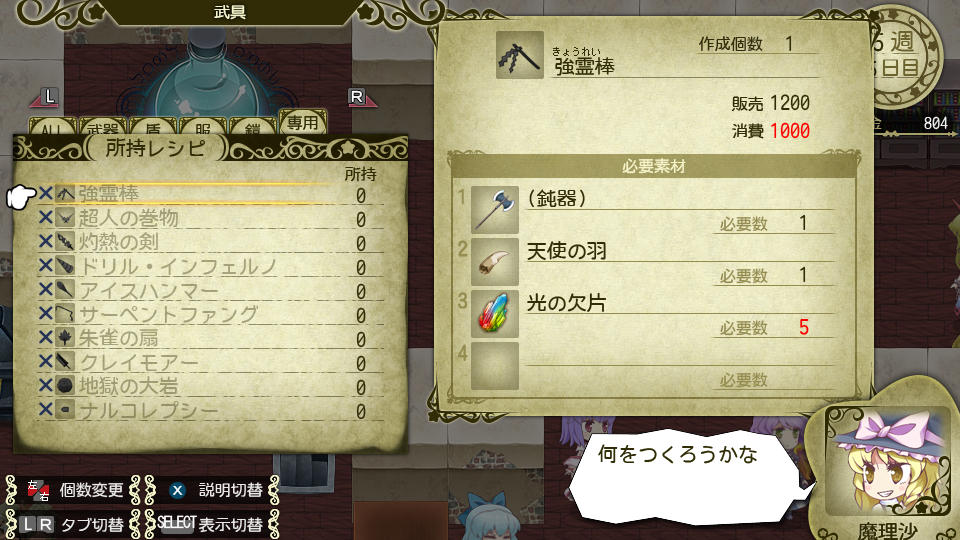 この時、その他のカテゴリに、作成費用に対する売却額が高い換金アイテムというものが存在するので、資金不足になったら換金アイテムの素材を取りにいって作成・売却して資金を稼ぎましょう