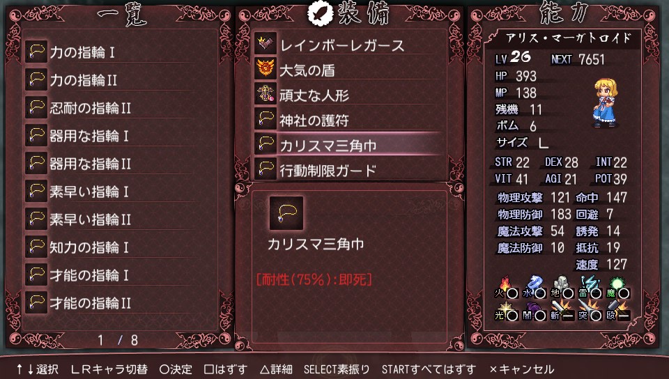 うろ覚えだけど衣玖さんは即死攻撃を使ってきた気がするので、念のため装備で即死対策をしました