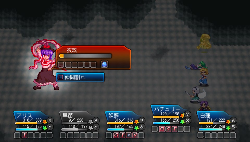 今回は偶然にもメインアタッカーの妖夢とパチュリーに感電の耐性装備をつけていたため、最後まで攻撃の手を緩めずに攻められました