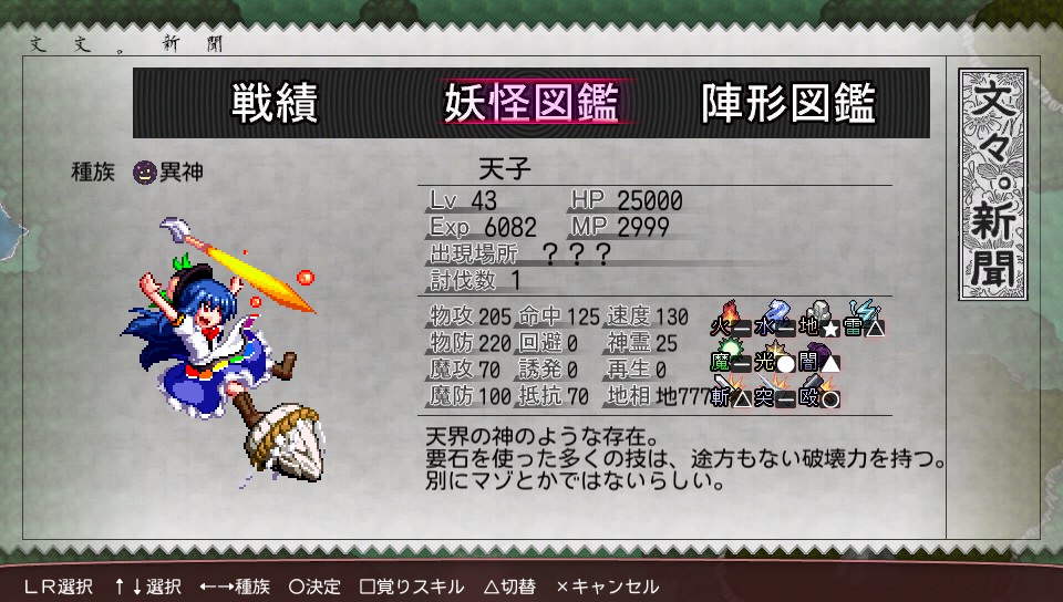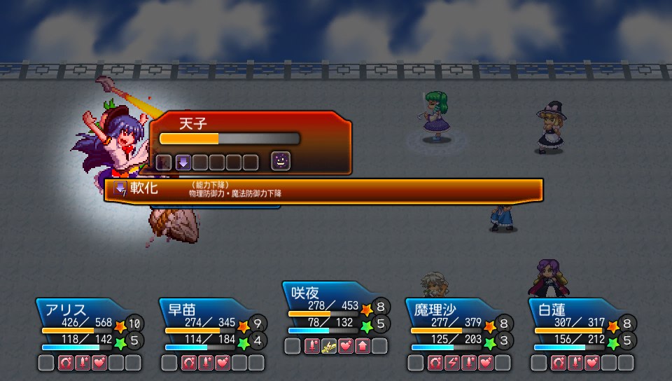 まず、天子は衣玖さんとは属性耐性が逆で、雷属性が弱点なので、今回はパチュリーではなく魔理沙を投入
