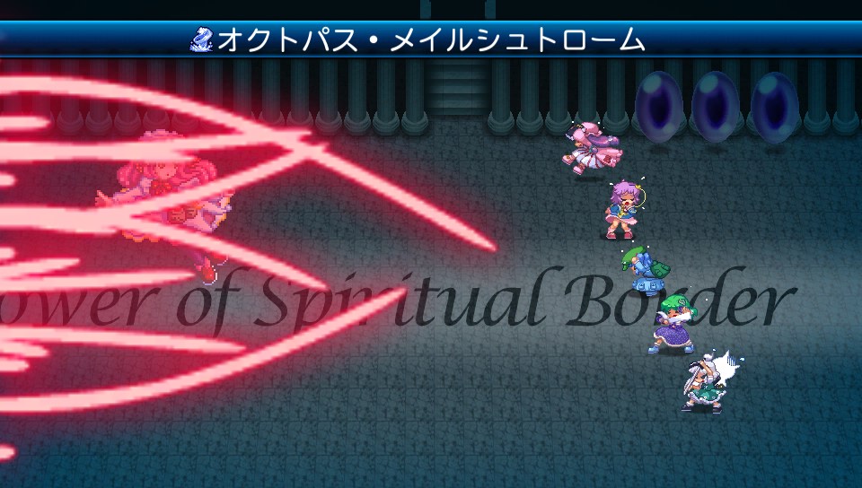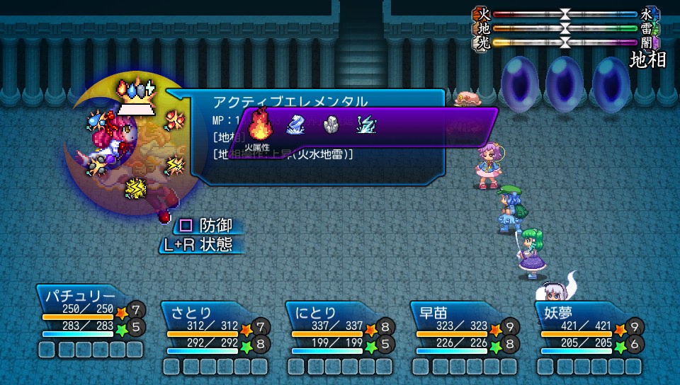 弱点は雷属性だが、ランドが水に傾くとボスの使うオクトパス・メイルシュトロームに即死の追加効果がついて非常に危険なため、開幕にパチュリーのアクティブエレメンタルで火の地相に傾けておきます