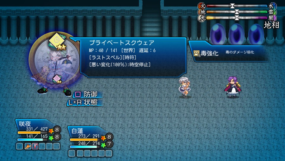 白蓮でバフをかけて咲夜の火力を上げた後、咲夜がプライベートスクウェアで時を止めている間に速攻撃破する戦法です