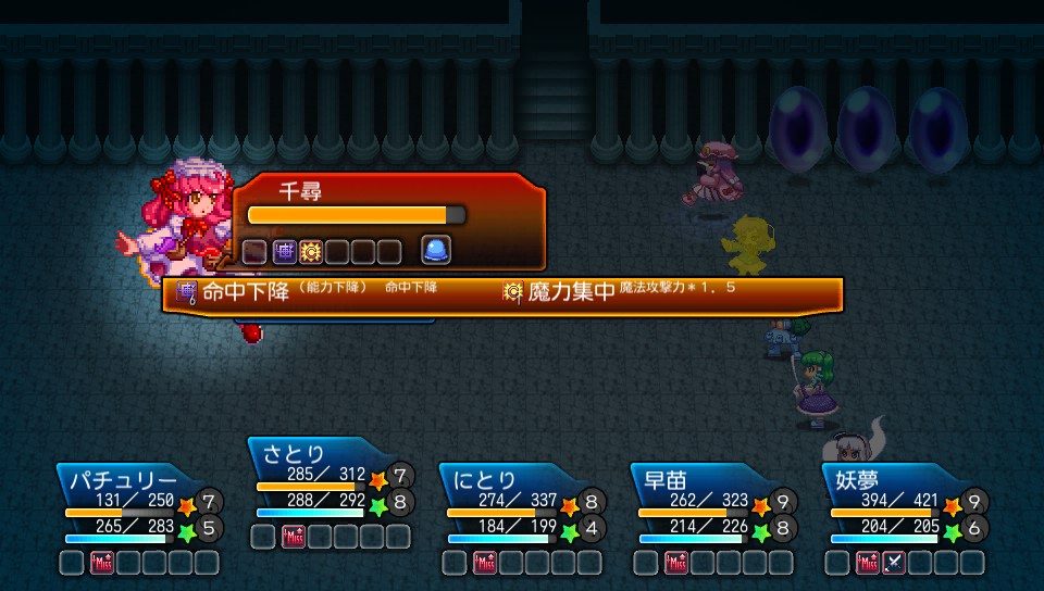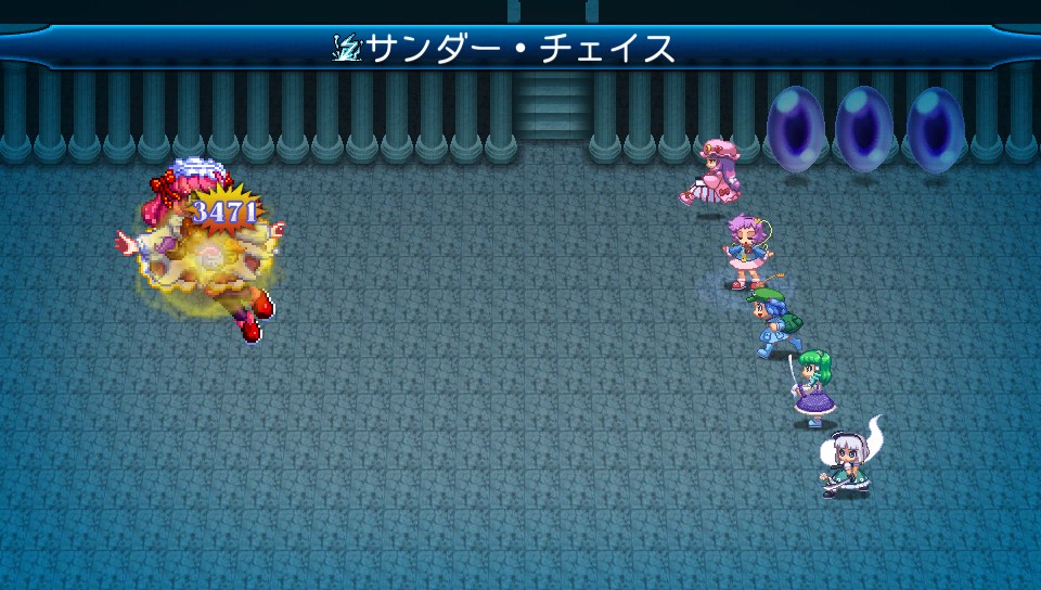 あとは早苗、さとり、パチュリーの雷属性攻撃に合わせてにとりのサンダー・チェイスをお見舞いすればOK