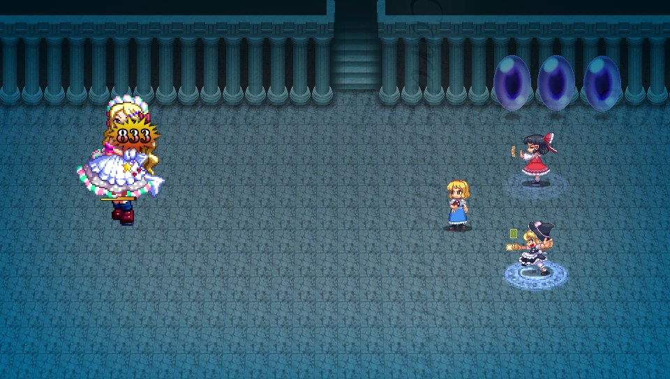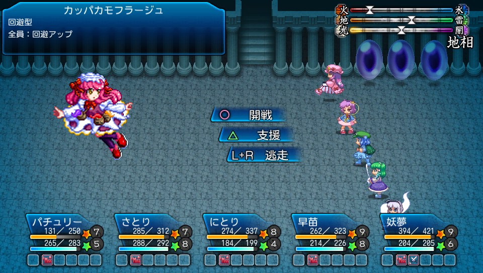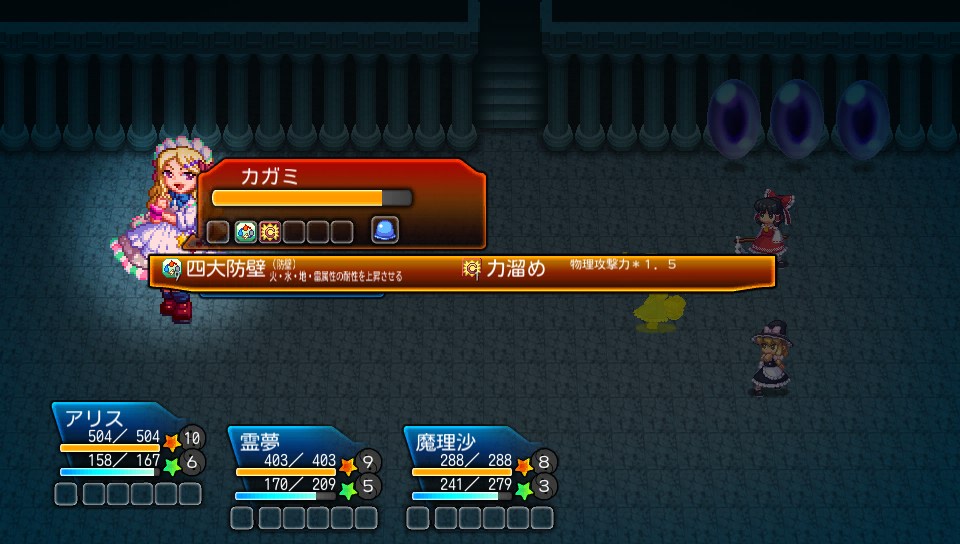 カガミはたまに闇属性のスペルカードを使うため、最初に霊夢の霊撃粒子散布で光の地相を傾けておくとダメージを抑えられるだけでなく、霊夢の光属性魔法の威力も上がるため一石二鳥です