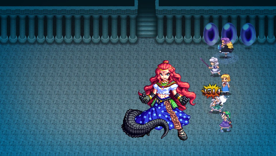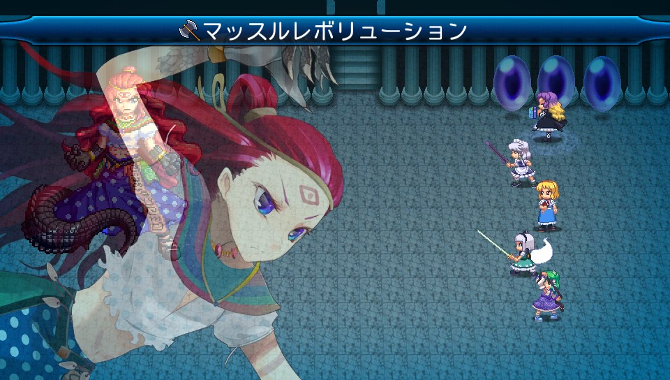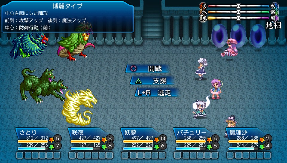 弱点は斬と雷なので、パチュリーと魔理沙の魔法が良く効きますが打たれ弱いキャラだとボスの攻撃力に耐えられないので、ここは咲夜と妖夢に白蓮で雷属性を付与する作戦で