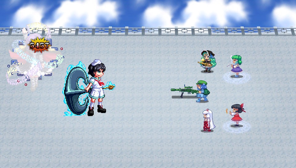 ムラサの方は直接攻撃してこずにフィールドを張ってくることが多いので、早苗のサーペントバリアで上書きしつつゴッドウェポン装備の妹紅で沈めよう