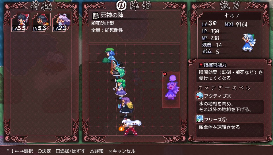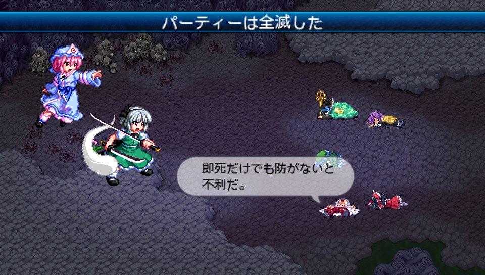 初回挑戦時は火力重視で速攻を仕掛けようとしたんですが、妖夢のHPが思ったより高く、幽々子は攻撃を避けるので押し切れず、そうしている間に即死で次々にやられて全滅しました(>_<)