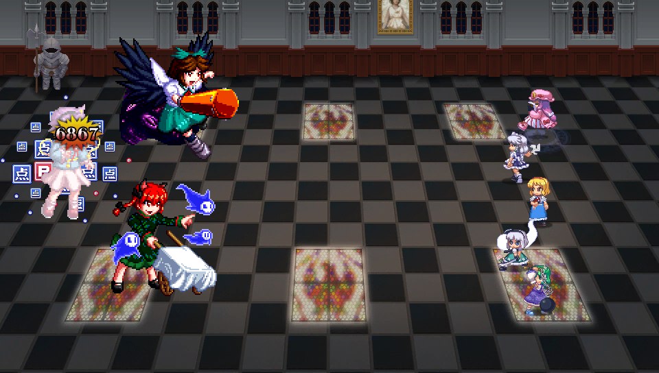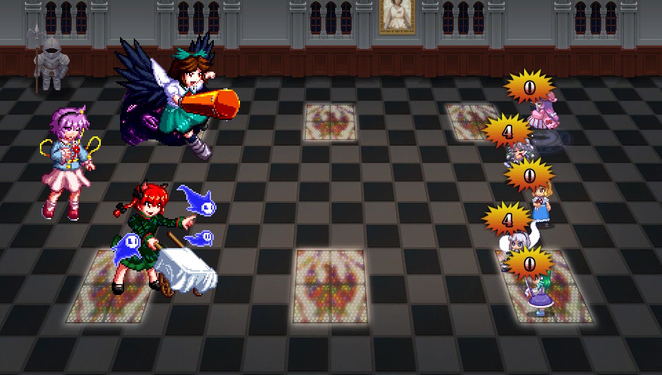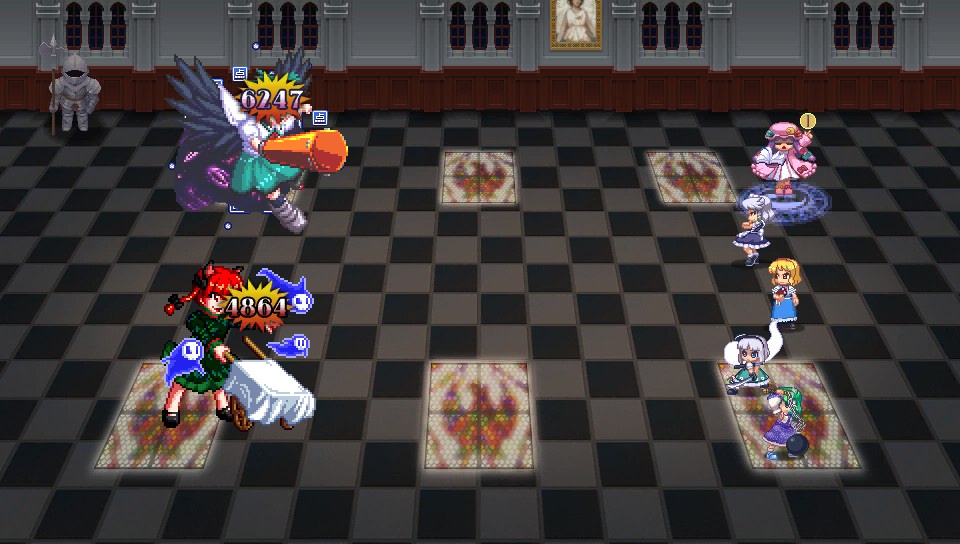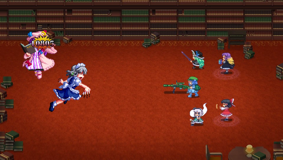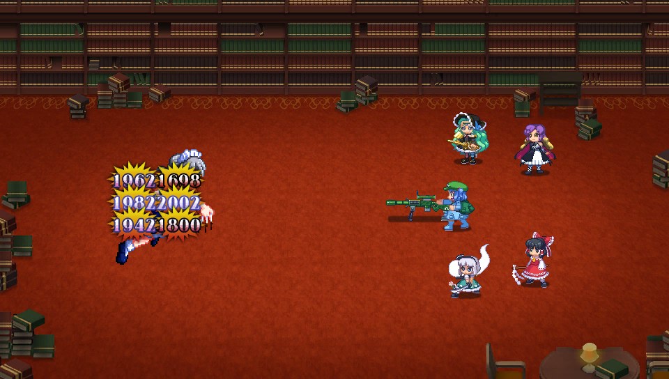 咲夜もパチュリーも1ターンに1回行動で、強力なスペルカードを放つ前にはボム充填の予備動作が必要なので、ボム充填したターンは攻撃してこないからこちらが攻めるチャンスだし、霊夢の二重大結界でパチュリーなら魔法、咲夜なら物理を防げば完封できるので、対処が非常に簡単です