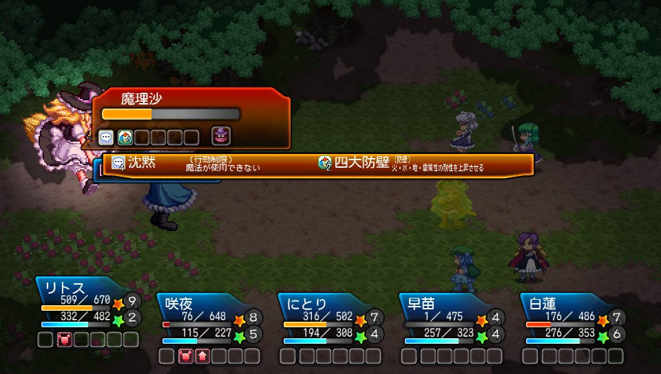 ただし、アリスは毎ターン高確率でリトルレギオンを使用し魔理沙をかばうので、運が悪いといつまでたっても魔理沙に攻撃が入らず沈黙させられないということも