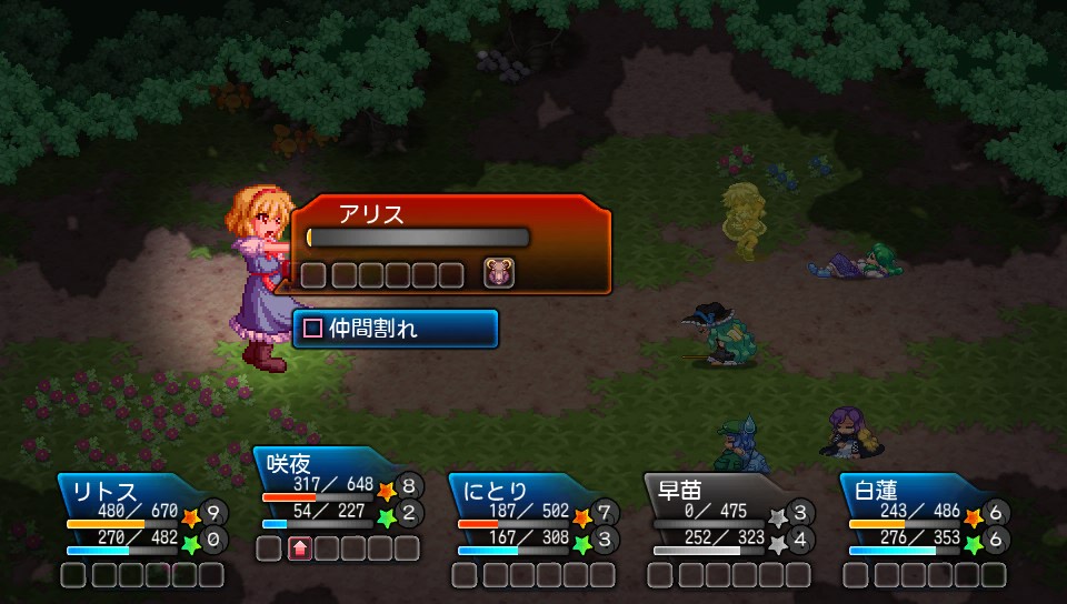 ペガサスやレイジーエイト、パーフェクト殺人ドールなどで魔理沙に攻撃が流れると手痛い反撃を受けてしまうので、咲夜はフルムーンリベンジ、リトスはマッスルレボリューションでアリスを集中攻撃するか、にとりのなんでもチェイスを使おう